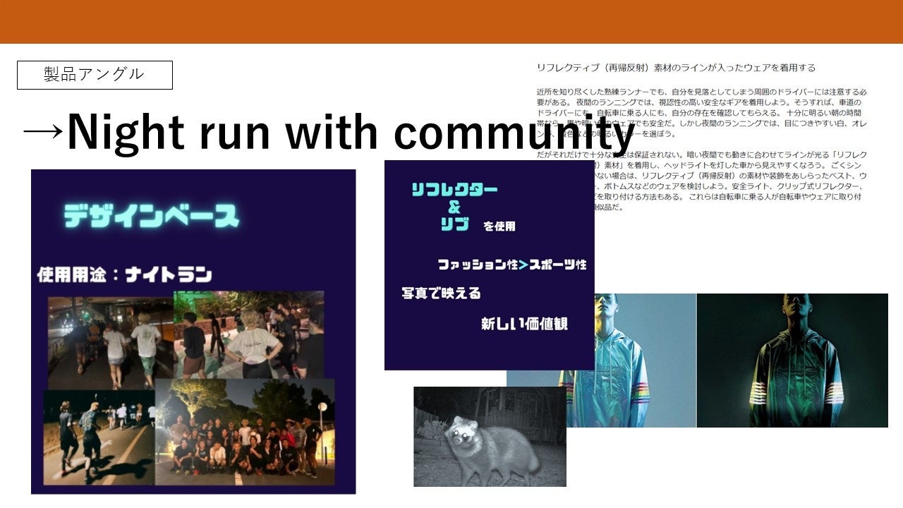 製品コンセプトは「Night Running with Community」です。一緒に走ったグループランニングでは、授業や業務の終了後に集まって走ったことで、そのほとんどが夜のラン、ナイトランニングになりました。都内の新宿や小石川辺りをメインに走るのですが、そういった場所でも路地には暗がりがあり、また車の往来に注意が必要なケースがあります。光を反射するリフレクター機能をキーディテールとすることでコンセプトを表現しています。