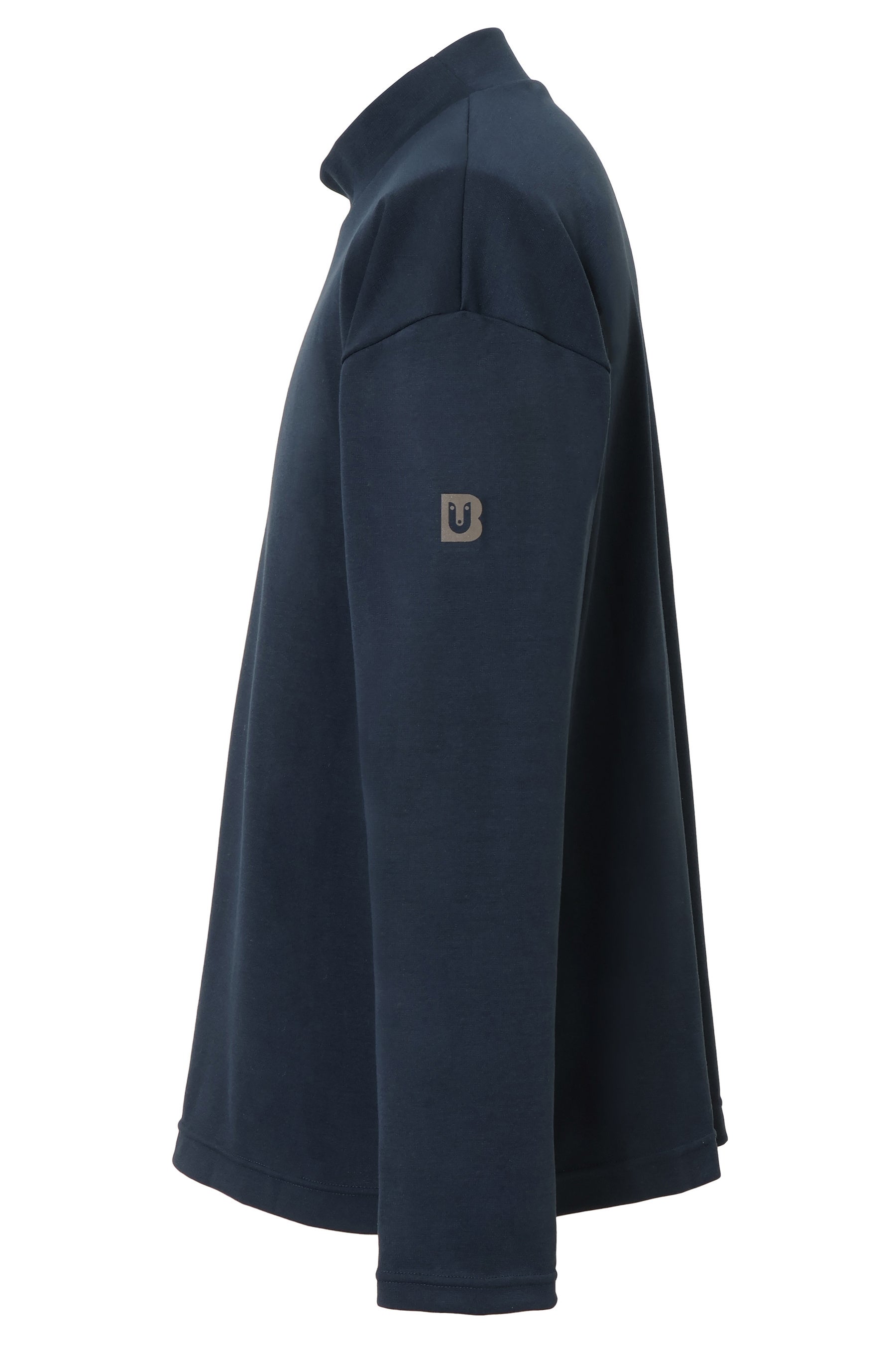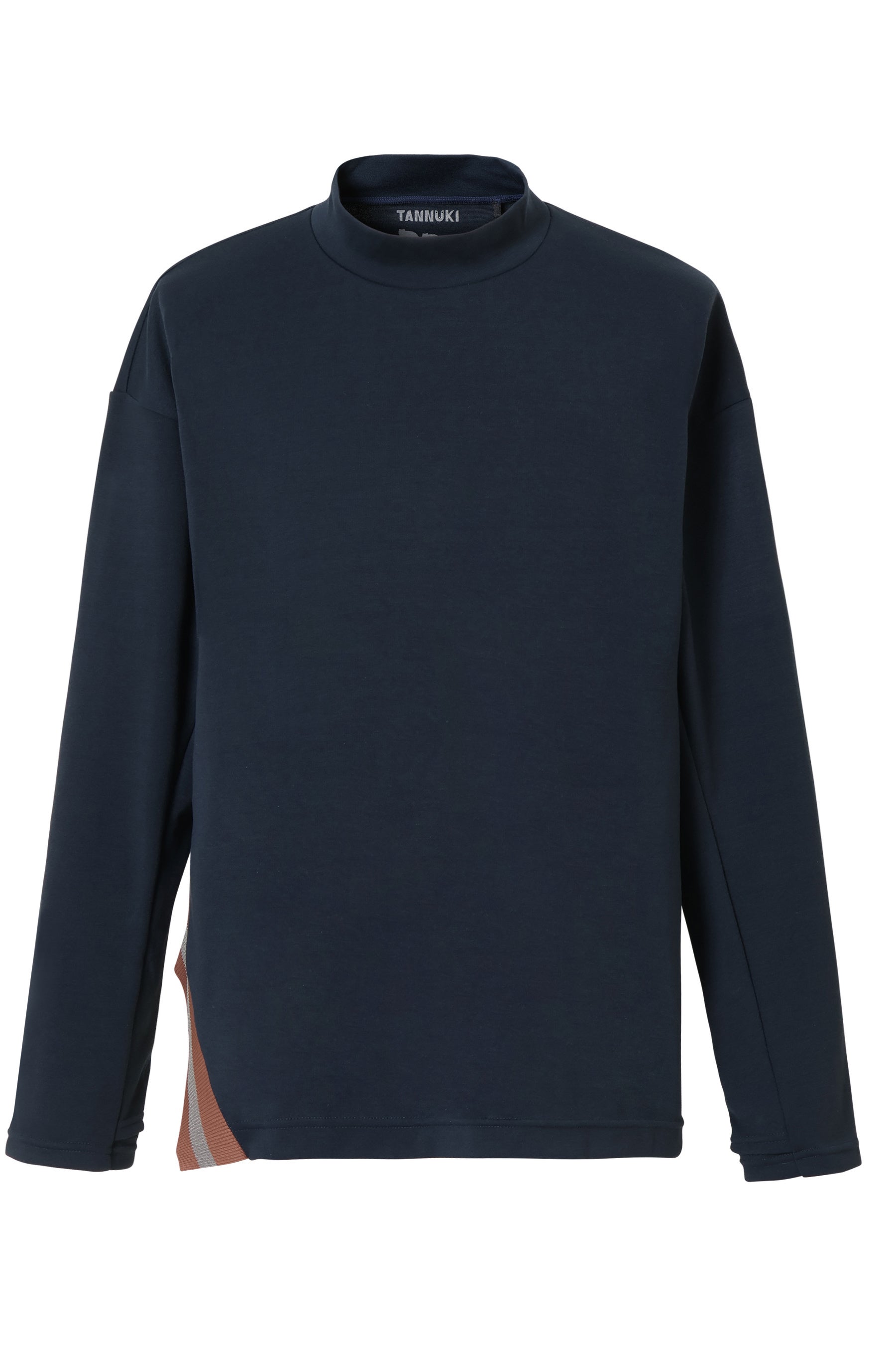 やや厚みのあるスウェットタイプの生地にモックネックデザインを合わせることで、寒い日のランニングに対応します。右裾の大きなデザインポイント以外はシンプルでクリーンな作りとなっており、普段の生活にも違和感なく溶け込むと思います。日常着として着てもらって、そのままランニングにも使ってもらえたらと。