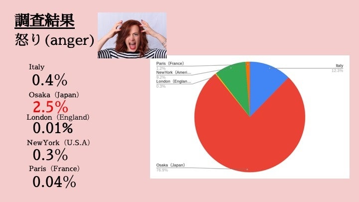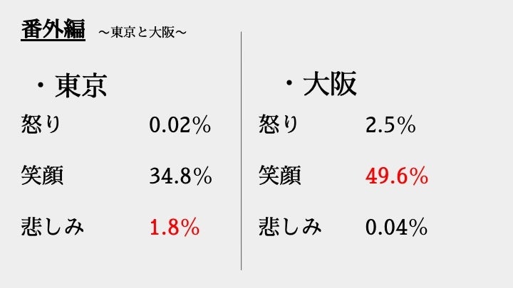併せて、「怒り」の比率も断トツに高く、大阪の人々は喜怒哀楽が激し目で、感情が表情に出やすい傾向が強いと考察されます。