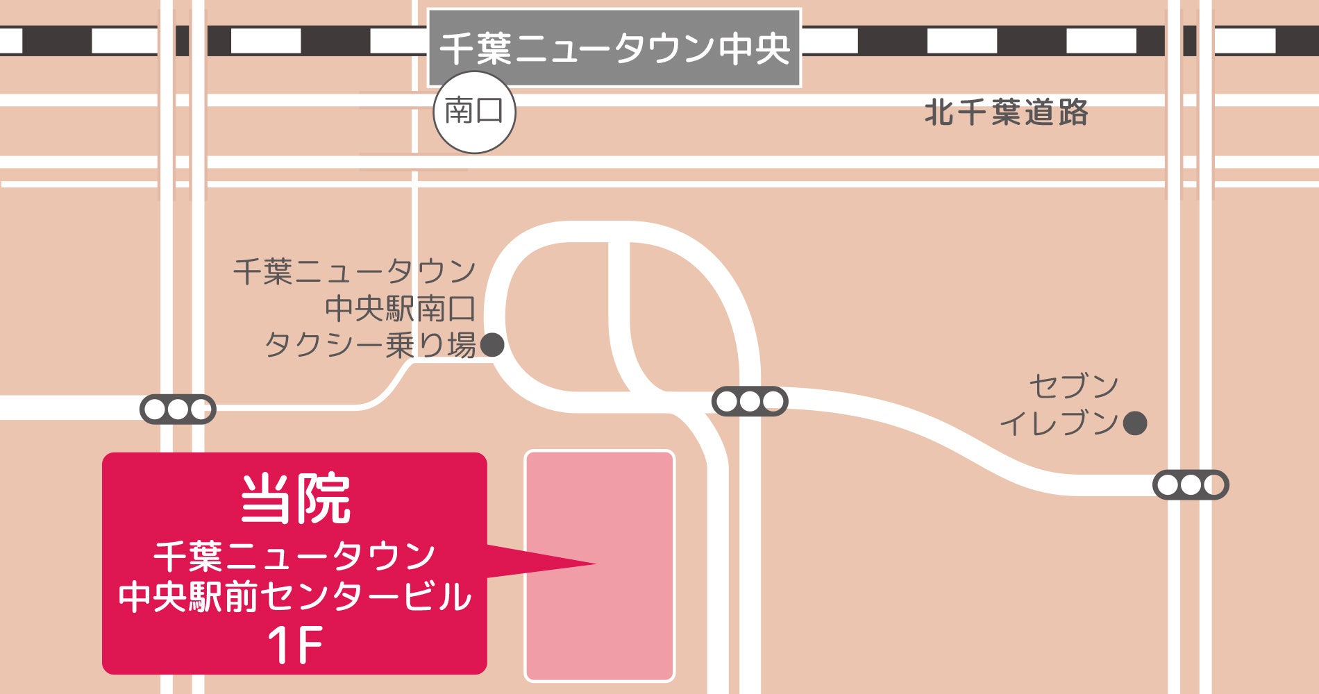北総鉄道 北総線・京成成田スカイアクセス線「千葉ニュータウン中央駅」徒歩約3分の「千葉ニュータウン駅前センタービル」1階で、朝9時から夜21時まで、土日祝日も毎日診療を行います。