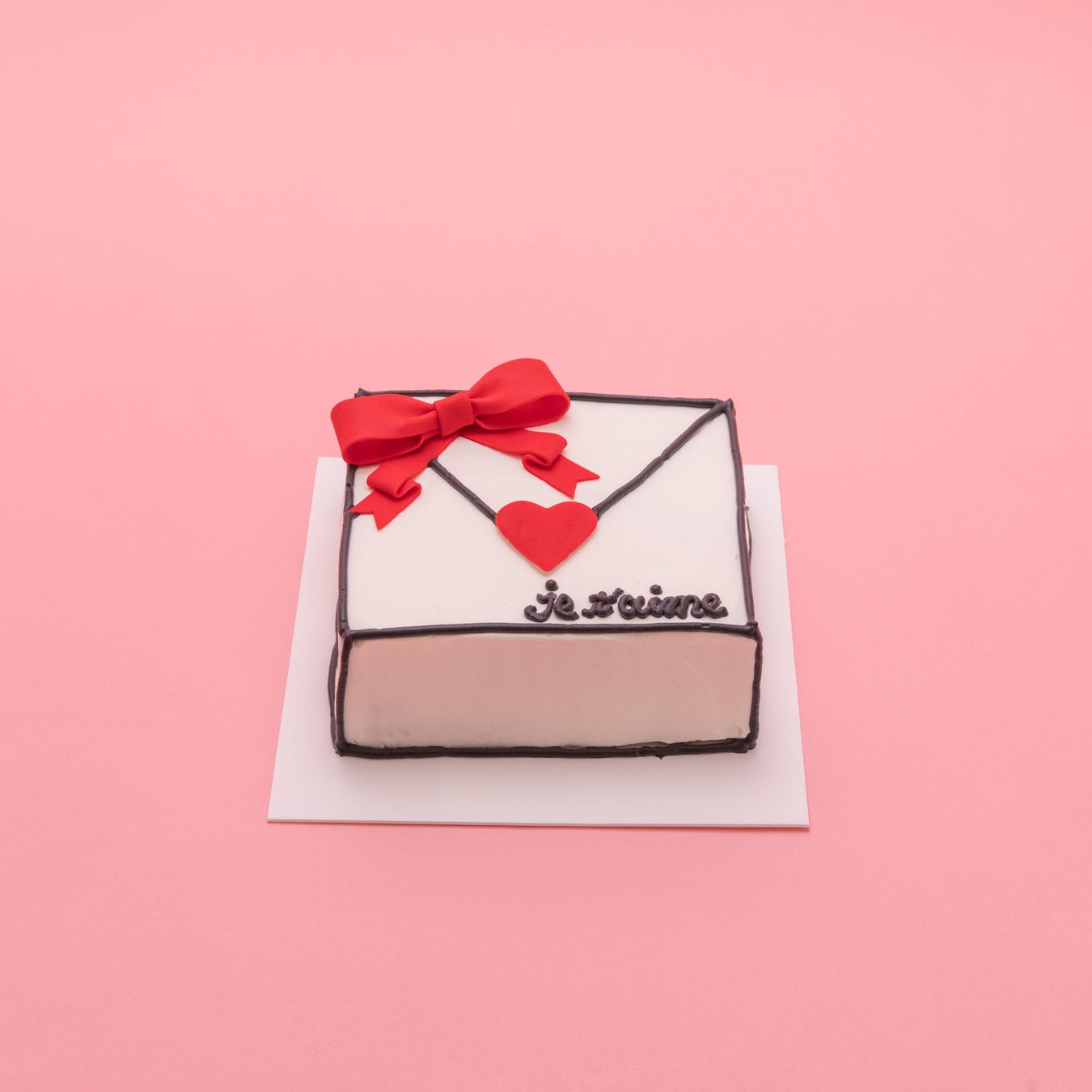 ラブレターをモチーフにした新デザインのケーキ。リボンをのせてよりかわいいデザインに仕上げました。