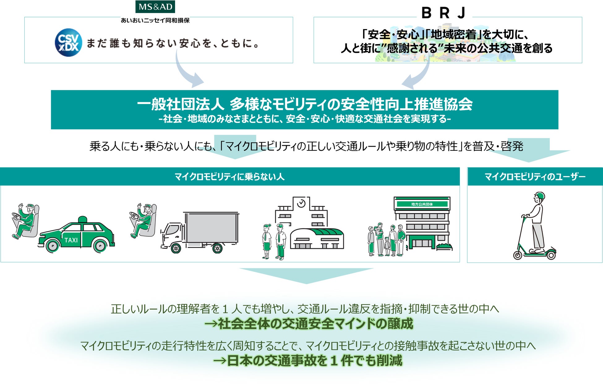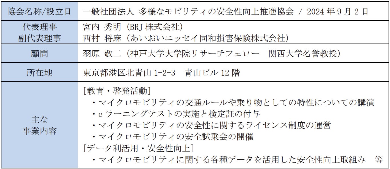 新納 啓介、以下「あいおいニッセイ同和損保」)と次世代モビリティ事業を展開するBRJ株式会社(代表取締役:宮内秀明、以下「BRJ」)は、「一般社団法人 多様なモビリティの安全性向上推進協会」を2024年9月2日に設立しましたのでお知らせします。