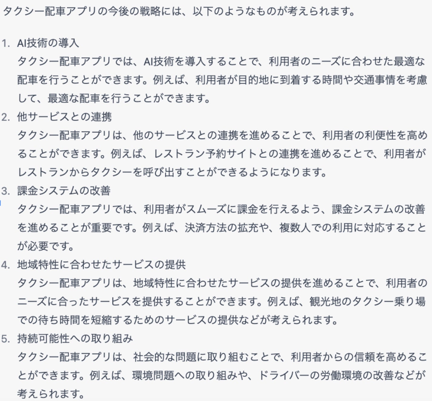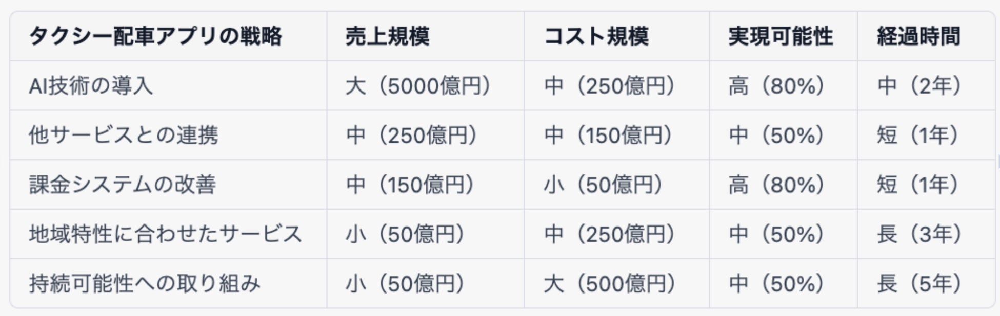*タクシー配車アプリの今後の戦略について教えて、に対してCalqBlitzにより2時間で半自動生成された「叩き台」としての戦略(数字等インプットはあえて厳密な数字から外している)