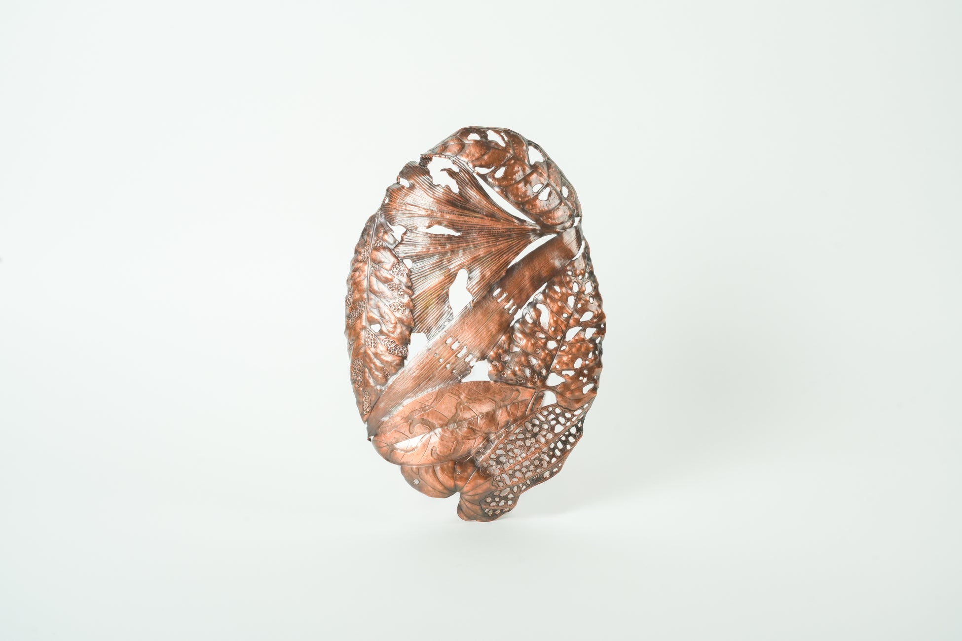 葉っぱを食べる虫たちと、虫に食べられる葉っぱたち。自然界の営みの一部が、人の手で造られた庭の中では害とされ虫たちは害虫となる。そして駆除される。そんな勝手な私たちは、自然界から見れば害人かもしれない。虫食い葉っぱを観察するうち、色んな種類の食べられ方がある事に気付きました。その食べ跡からは、食べる側の唸るような工夫と知恵が想像できました。それを銅で表現しました。