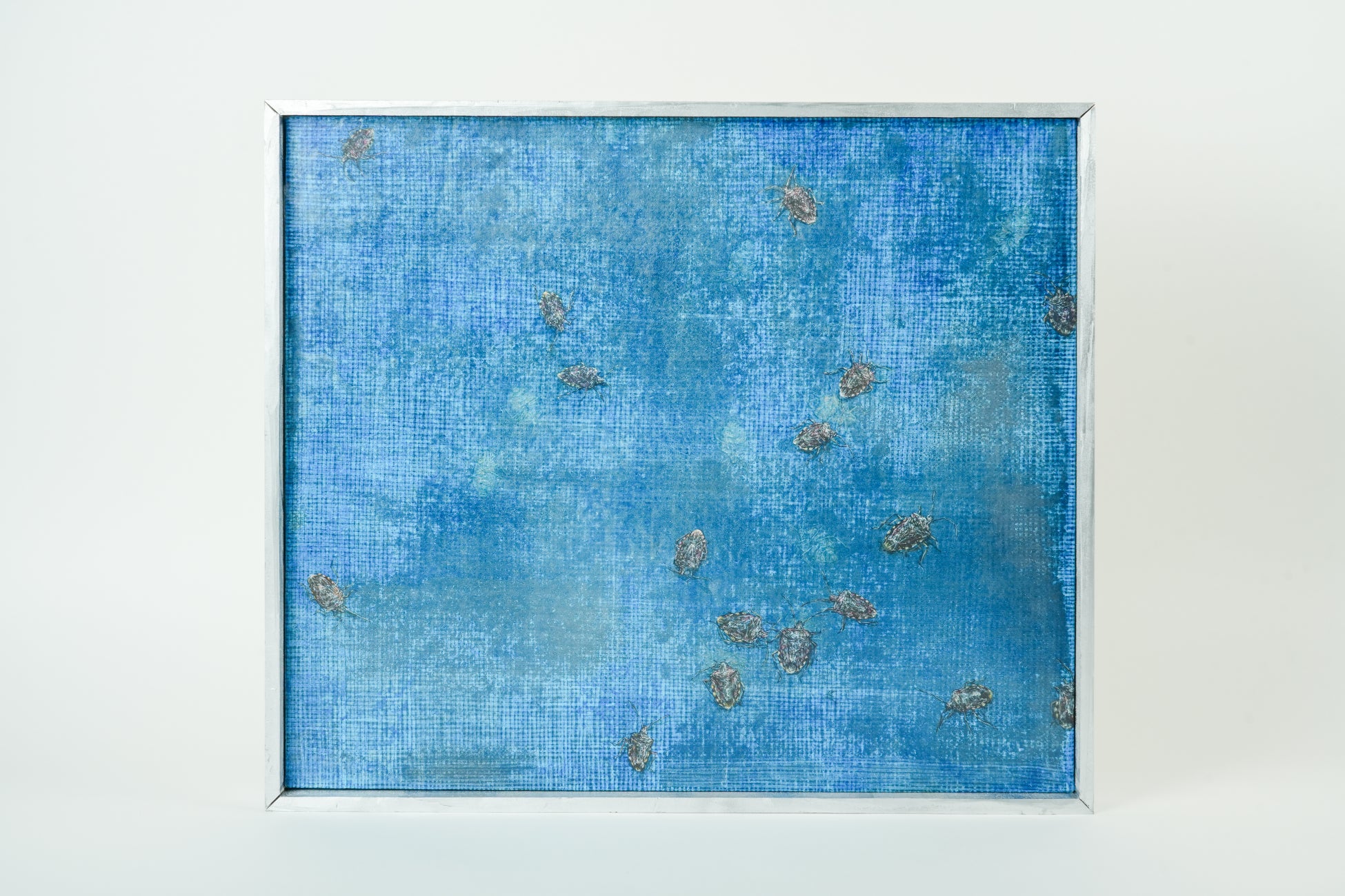東北の晩秋、山間の廃社に仕舞われていたブルーシートを冬支度のため引っ張り出したところ、そこは越冬を控えたカメムシたちの仮宿となっていた。シートはボロボロに劣化しており、カメムシが空けたであろう穴が無数にある。人間が自然に抗うために作り出した工業製品を自分たちの住処に作り替えてしまうカメムシたち。私はそこに、彼らの生きることそのものへの美しい執着と、人工と自然の間に横たわるある種の創造性を見た。