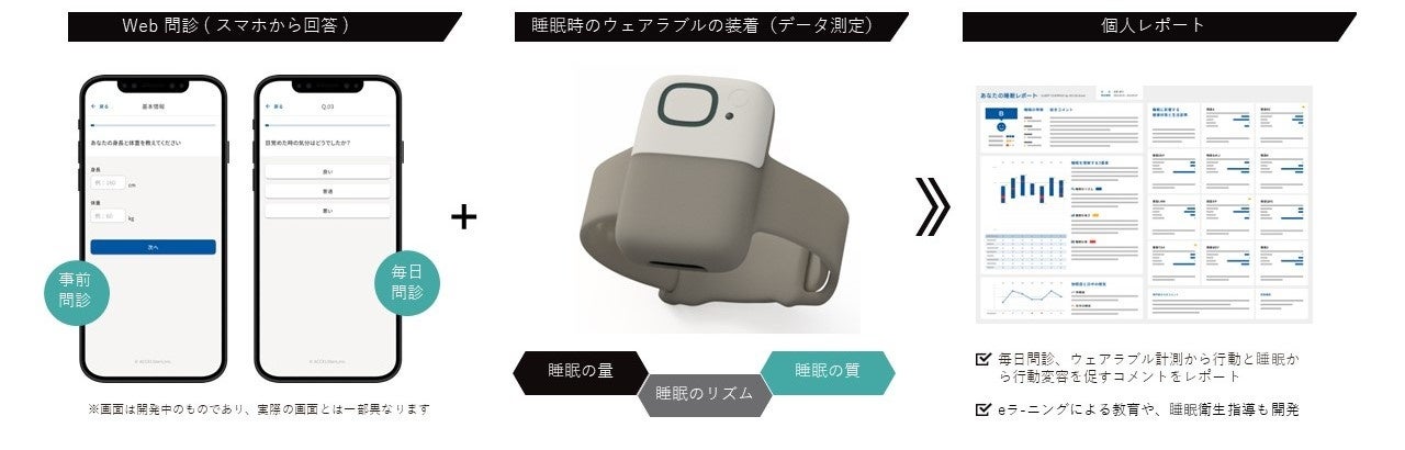 当サービスは日本では現在医療機関を通じて企業向け健康診断の追加検査として導入しております。端末を8日間装着していただき、腕の動きのパターンを捉えて睡眠の量・リズム・質や生活習慣を把握します。E-learningで睡眠に関するリテラシー向上も行ない、エビデンスに立脚した基準で睡眠を解析し、個人にカスタマイズした形で行動変容の提案を行う総合的に5段階評価されたレポートとしてフィードバックいたします。 すでに国内では株式会社ブリヂストンなど健康経営に関心の高い大手企業や久留米市、郡山市、熊本県などの自治体が実証実験に参加し、また、睡眠不足による業務上の事故を防ぎたい製造業や物流業が決まっており、健康経営・市民健康増進に関心が高い企業・自治体を対象にして2023年5月25日より提供開始しております。