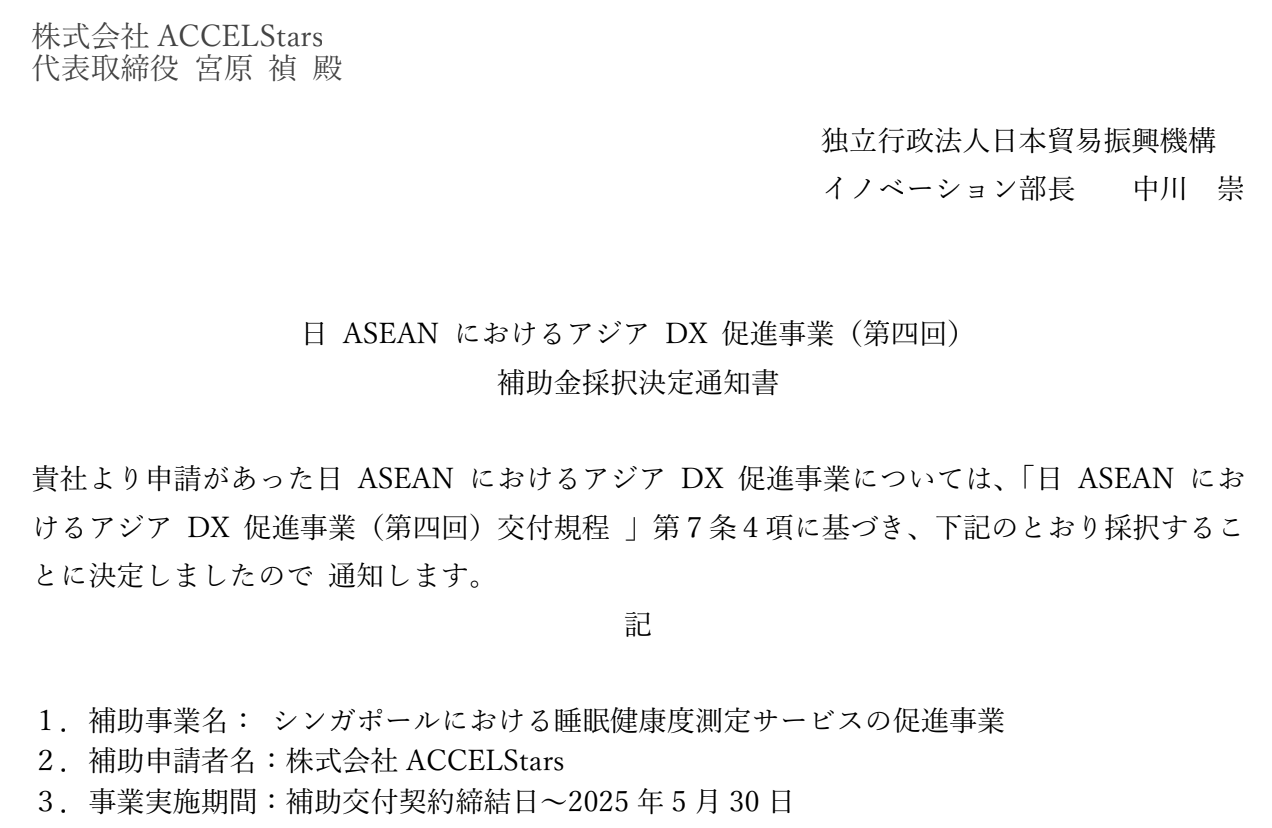 シンガポールを拠点に、ACCELStarsの技術ならびに、睡眠計測サービスのスリープコンパス( https://sleep-compass.com/ )の実証実験として、開始して参ります。事業実施期間は、程なく締結される補助交付契約締結日〜2025 年 5 月 30 日とされる予定です。すでにシンガポール本拠地の協業パートナー候補とはMOU締結に向けて協議中です。