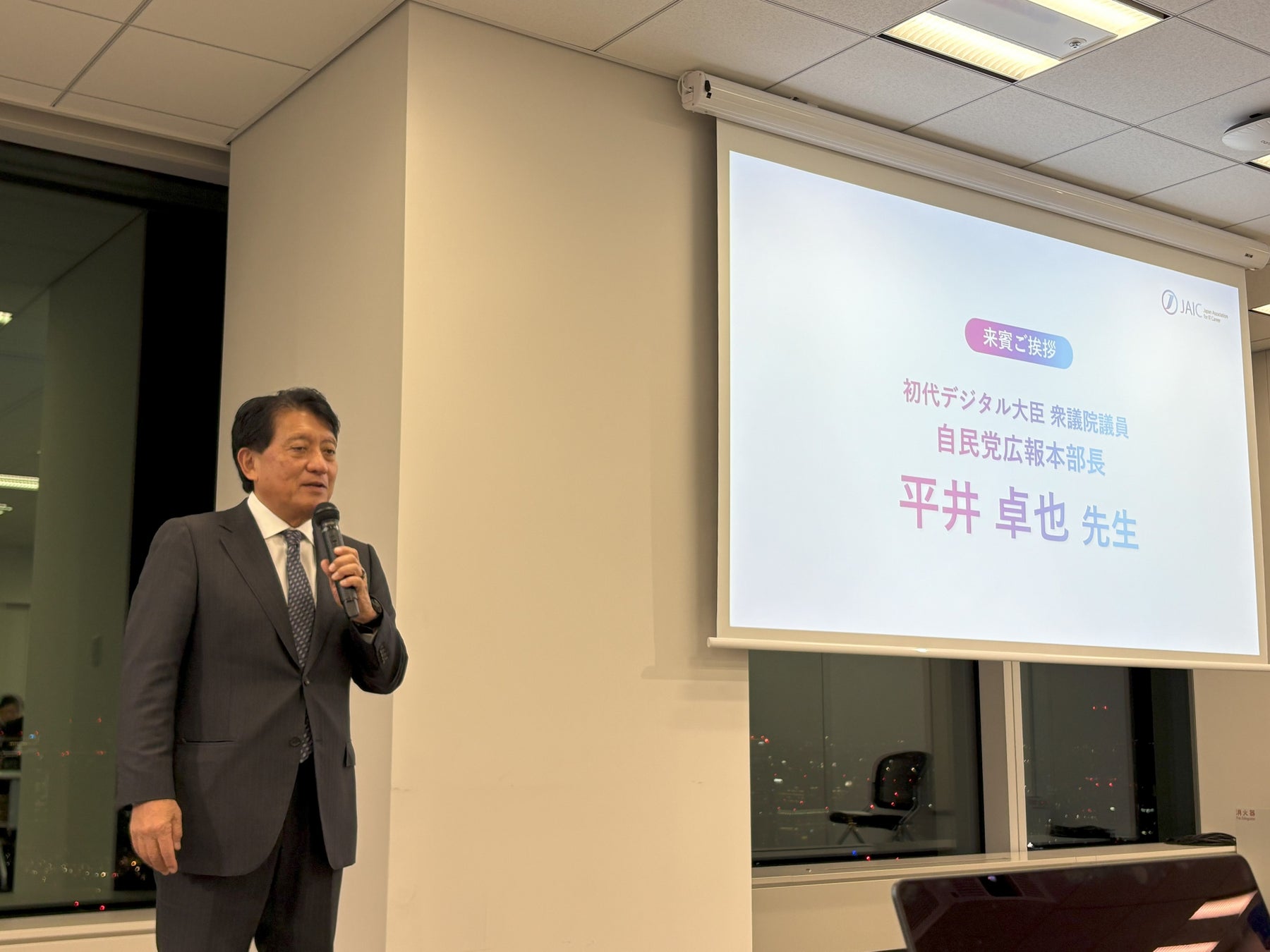 慶応大学教授 村井純先生、Astar Network 渡辺創太氏を迎え、研究会を実施してきたJAICが第2回海外視察(アメリカ)報告会を初代デジタル大臣 平井卓也先生を来賓に迎え実施いたしました。
