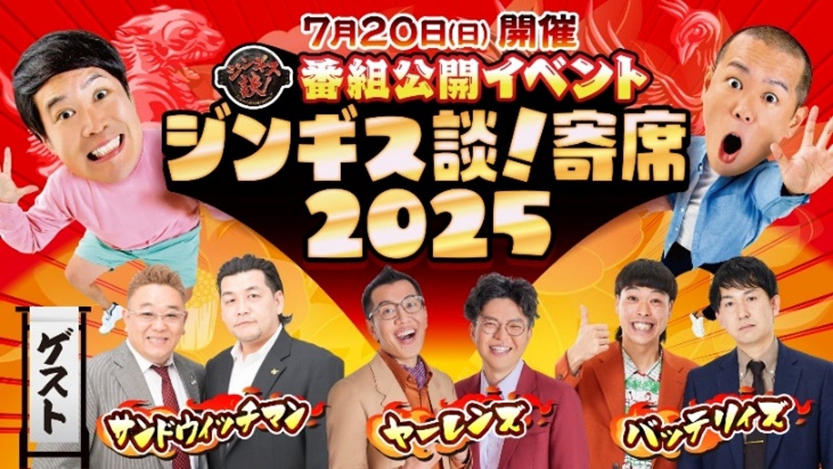 HBCテレビは、タカアンドトシがMCを務める人気トークバラエティ「ジンギス談!」の番組公開イベント、「ジンギス談!寄席2025」を開催します。イベントは2回公演で、昼の談では、ゲストにサンドウィッチマンを招いて【公開収録】。夜の談では、タカアンドトシ、サンドウィッチマン、ヤーレンズ、バッテリィズによる【ネタ祭り】に加え、バッテリィズをゲストに迎え【公開収録】を行います。さらに、初の試みとして、配信限定の副音声をヤーレンズが担当します。