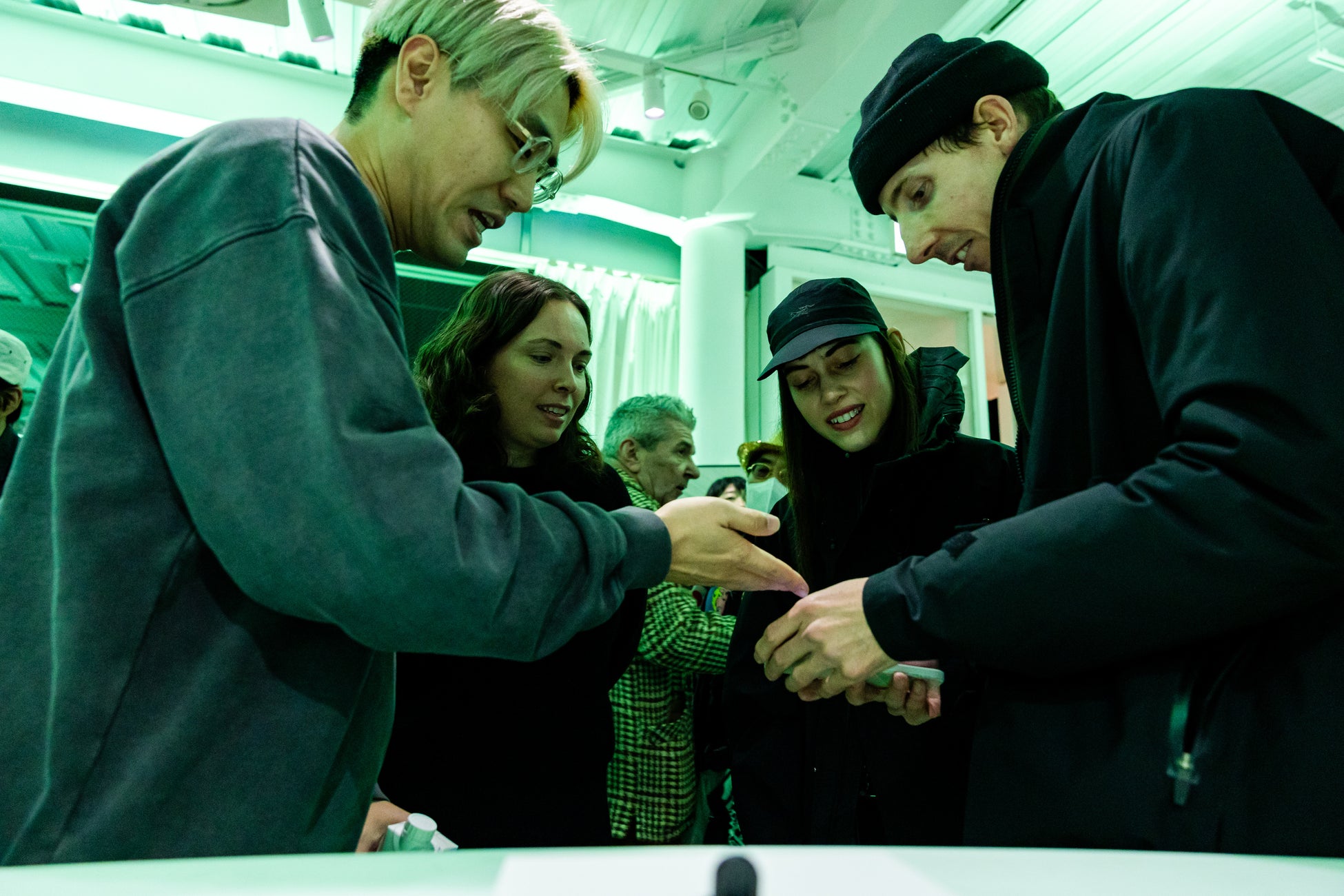 イベントはNothingのマーケティングディレクター佐藤俊樹氏の挨拶でスタート。インダストリアルデザイナーのアストリッド・ヴァンミュイーズ氏は「自分たちがデザインした製品を、初めて目にする方の反応を見られるのがデザイナーとして楽しみですし、勉強になります。」とコメントしました。またデザイナー/建築家の赤﨑健太氏は今回のデザインに至った経緯として「コンセプトの ”Glow in the dark”、蓄光素材、そしてNothingが大事にしているコミュニティを結びつけるアイデアを検討する中で、Nothingの特徴でもある昆虫に着目しホタルをモチーフにする案が浮かびました。ホタルは光でコミュニケーションをとる昆虫なので、ストーリー的にもNothingと重なる部分がありました。」と語りました。