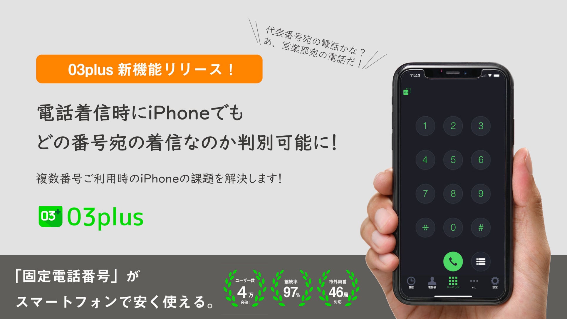 回線工事不要のクラウドPBX「03plus」を提供する株式会社グラントン(本社:東京都渋谷区、代表取締役:井本賀津雄、以下「当社」)は、 2022年4月14日より、03plusの機能アップデートをおこない、iPhoneでの電話着信時に着信先番号を通知させ、どの番号宛の着信なのか判別が可能になりましたことをお知らせいたします。