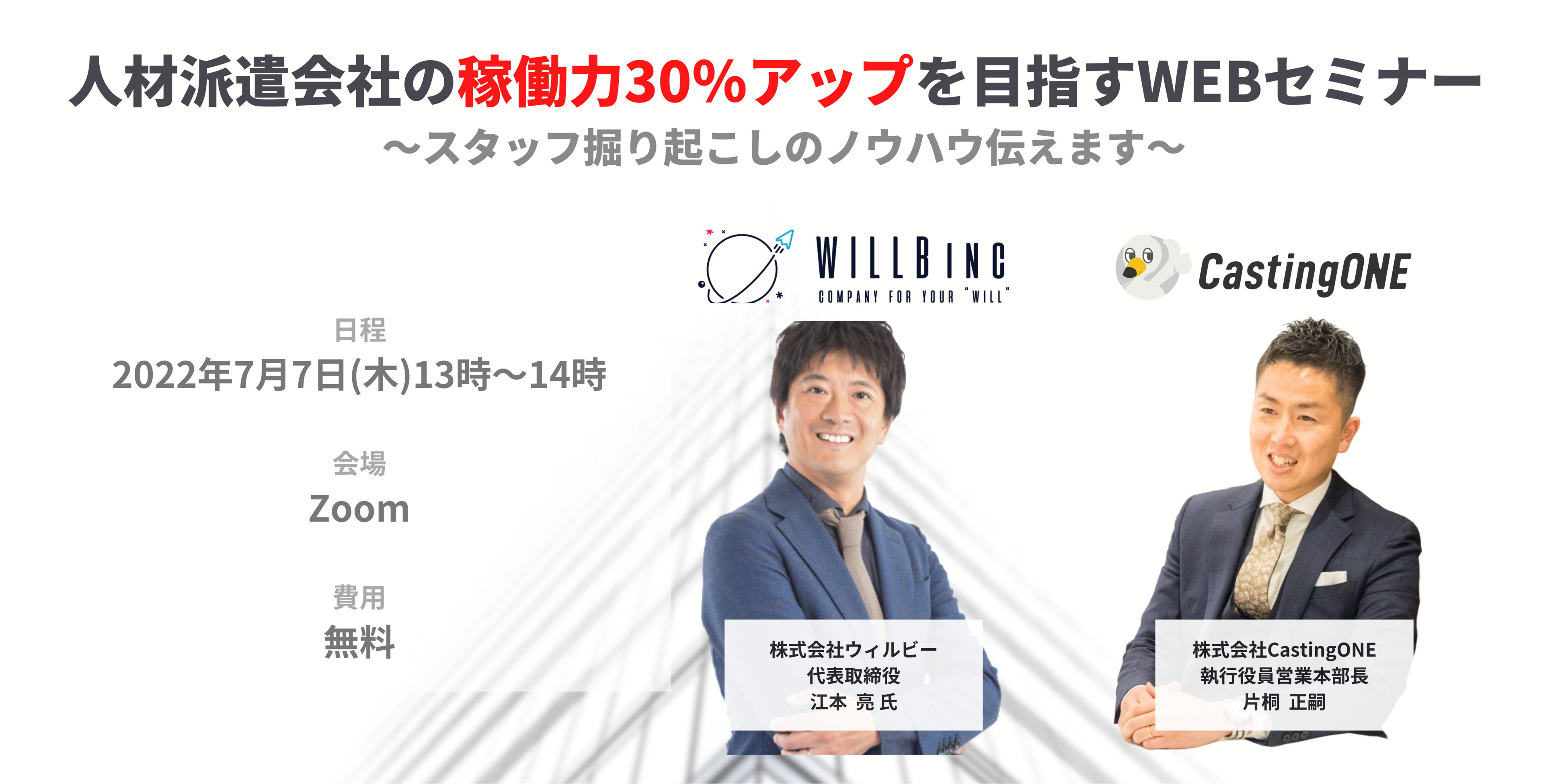 株式会社CastingONE(キャスティングワン、本社:東京都渋谷区、代表取締役:野澤 怜司)は、株式会社ウィルビーと共同で特別共催オンラインセミナーを開催致します。