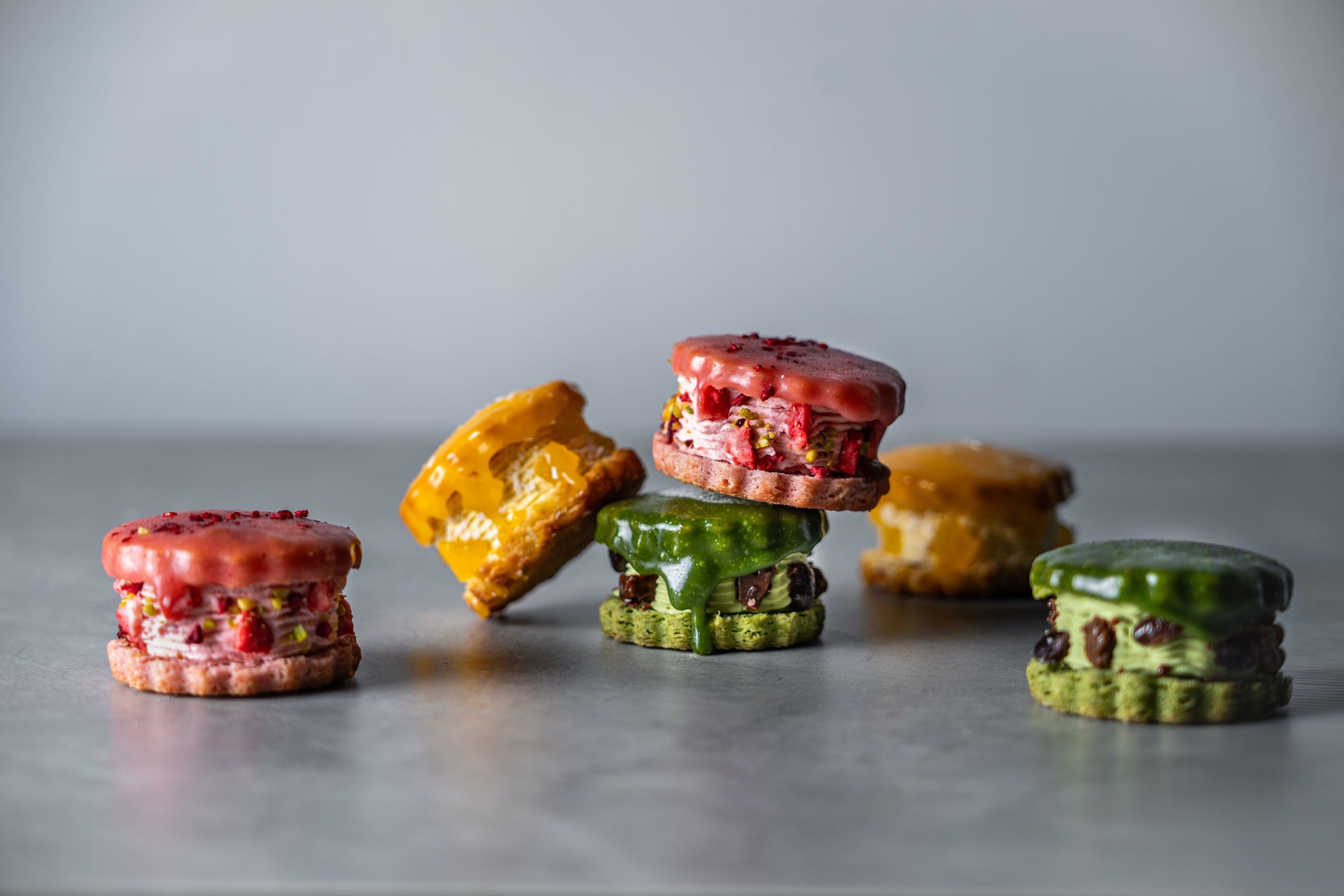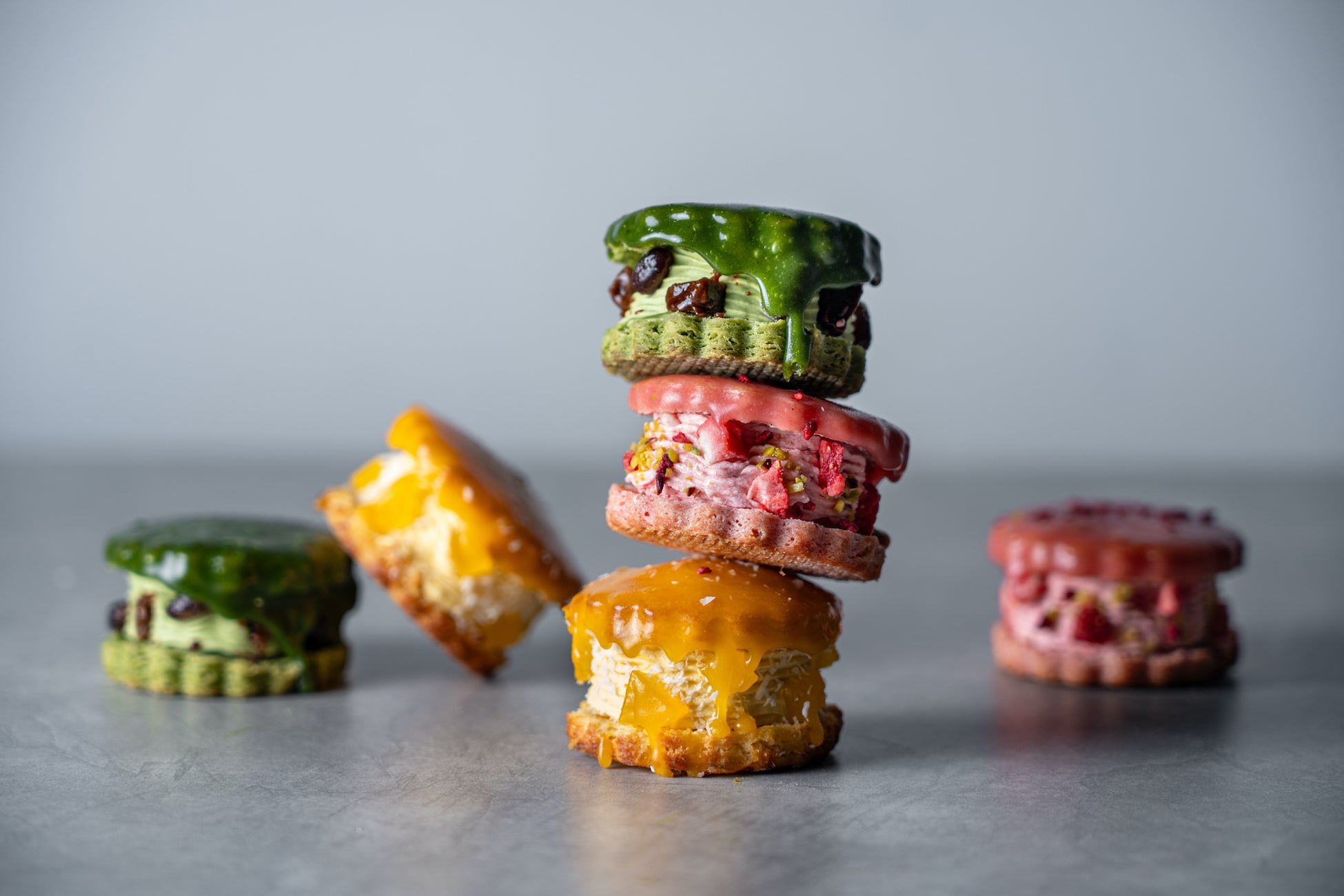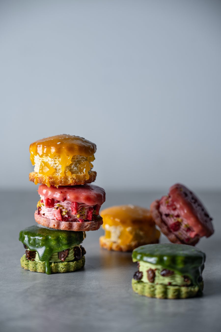 ストロベリーのスコーン生地に、ストロベリームースと濃厚なストロベリークリーム、甘酸っぱい味わいにバジルのアクセントが香る、ストロベリーバジルコンフィをサンドしています。ピスタチオと真っ赤なラズベリーで鮮やかに彩りました。