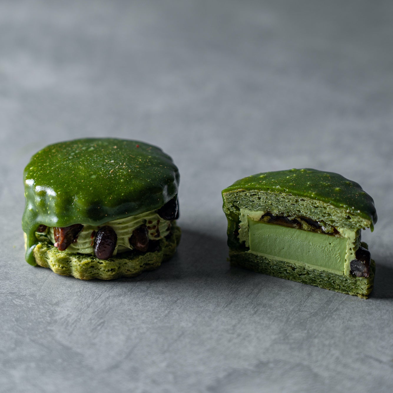 宇治抹茶の緑鮮やかなスコーン生地に、香り豊かな宇治抹茶のムースと宇治抹茶クリーム、濃く深い味わいを引き立てる黒糖ジュレをサンドしています。香ばしい黒糖ロッシェと小豆でトッピングし、宇治抹茶のグラサージュに金粉を添えて和の風合いに仕上げました。