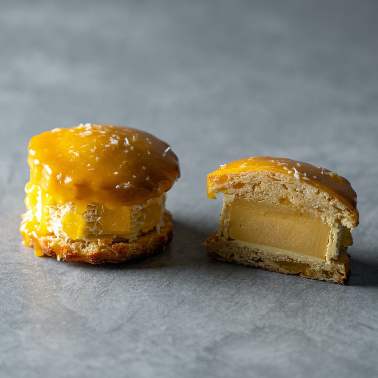 マンゴーのスコーン生地に甘酸っぱいマンゴームースと、とろけるような味わいのマンゴークリーム、南国果実のパッションフルーツを使ったリリコイバターをサンドしています。トッピングには、夏を彩るココナッツを散りばめ、マンゴーと合わせています。
