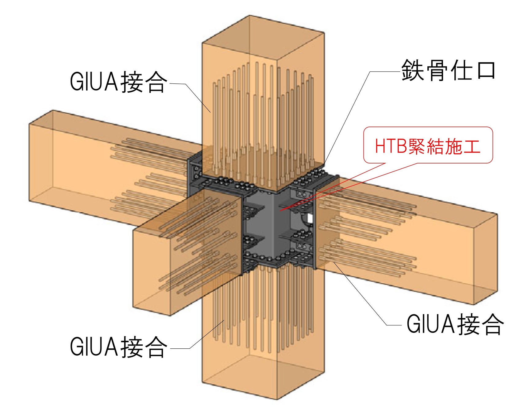 本事業では、中高層木造の普及拡大と多用途への対応を目的として開発された汎用性の高い“P&UA構法(Panel & Unbonded Anchor Structure System)”を採用します。国産スギ・ヒノキの構造用集成材を用いた「二方向ラーメン架構」に加え、1階下屋部分には国産材を柱・梁に用いた在来軸組みによるシンプルな架構としています。