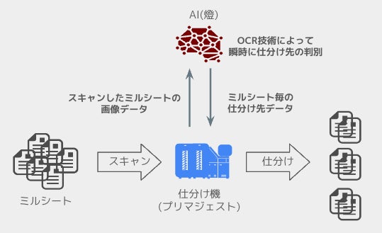 本プロジェクトでは、プリマジェストの紙の仕分け機(SP3000)によってスキャンした電子データをもとに、燈のAIがミルシート毎の仕分け先データを作成し、本データをSP3000へ連携します。