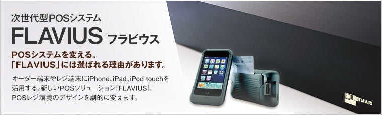 次世代型POSシステム「FLAVIUS(フラビウス)」はPOSレジ環境のデザインを劇的に変えます。オーダー端末やレジ端末にiPhone、iPadなどApple社の革新的なユーザーインターフェースを活用する新しいPOSソリューションと言えます。特徴として、①スタイリッシュなデザイン、②導入、運用コストを抑えられる、③お客様のニーズに合わせた自在な仕様にできる、④豊富な利用実績(2021年現在、導入実績3500ライセンス以上)などが挙げられます。