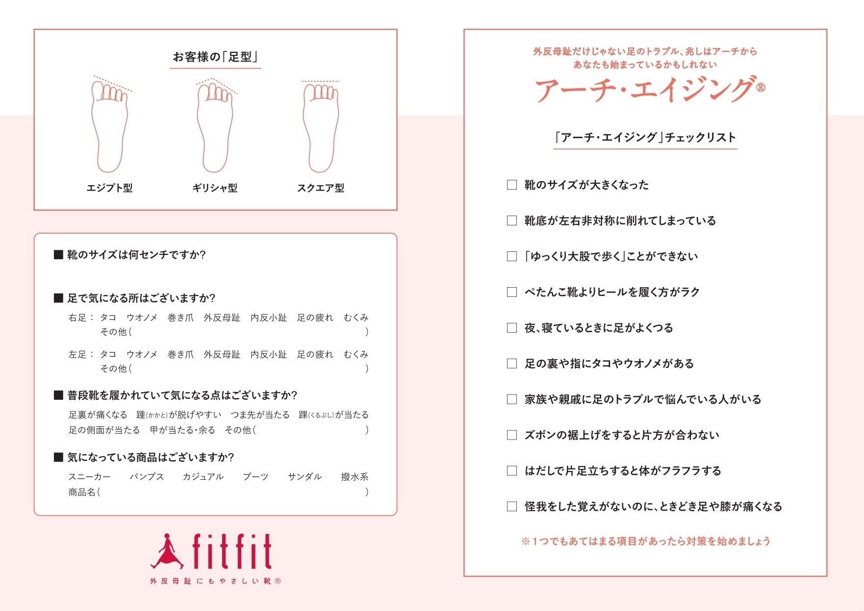 3/1(火)~3/8(火)の期間中、fitfit実店舗へご来店くださった方に、下記チェックシートを元に足をチェックさせていただきます。