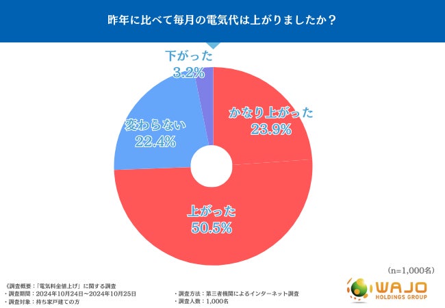 まず初めに、戸建てに住んでいる方に『昨年に比べて毎月の電気代は上がりましたか?』と聞いてみました。