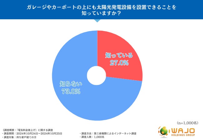 そこで、『ガレージやカーポートの上にも太陽光発電設備を設置できることを知っていますか?』と聞いたところ、「知っている(27.0%)」「知らない(73.0%)」と、こちらもまだ広く認知がされていないという結果になりました。