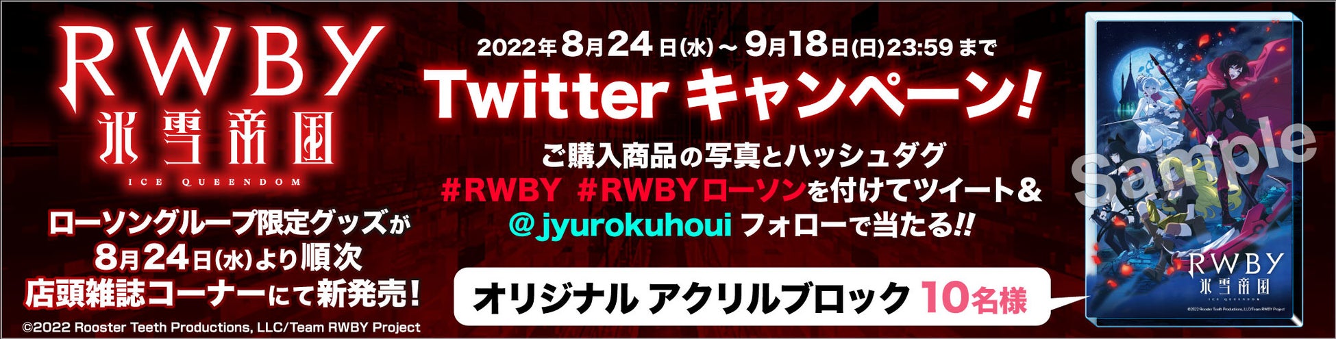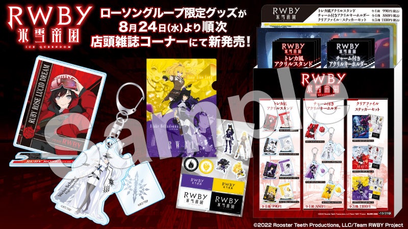 株式会社ジュロクホウイ(本社:東京都千代田区、代表取締役:赤松 武雄、以下 ジュウロクホウイ)は、人気アニメ『RWBY 氷雪帝国』より、チャーム付きアクリルキーホルダー、トレカ風アクリルスタンド、クリアファイル&ステッカーセットをローソン店頭雑誌コーナー(一部店舗)で新発売致します。