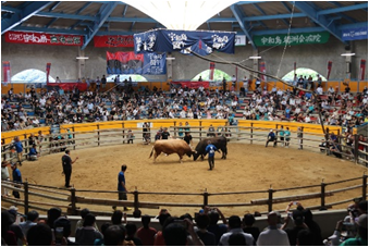 小高い丘の上に建てられたドーム型の闘牛場の中心、直径20mの土俵で1トン超の巨牛同士が激突します。