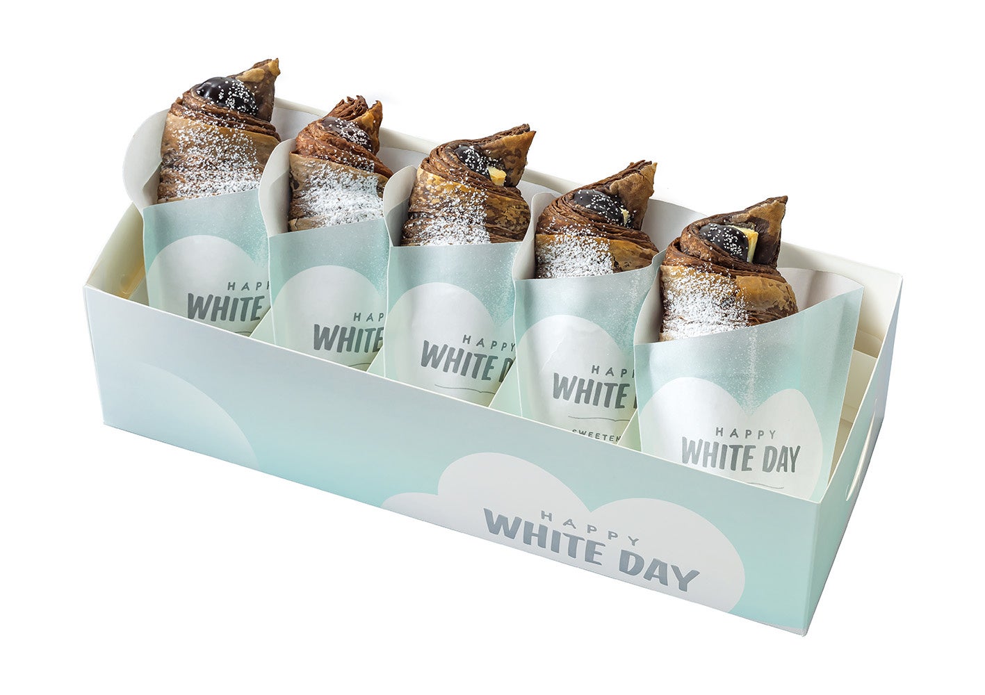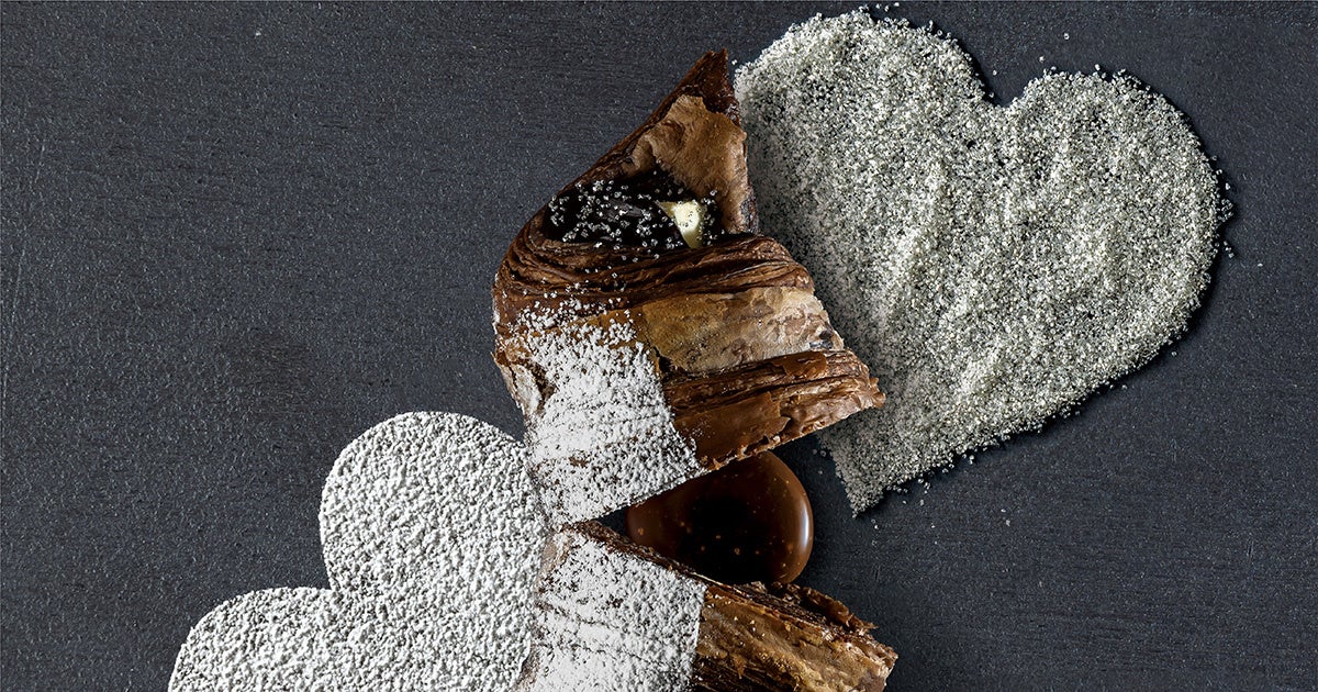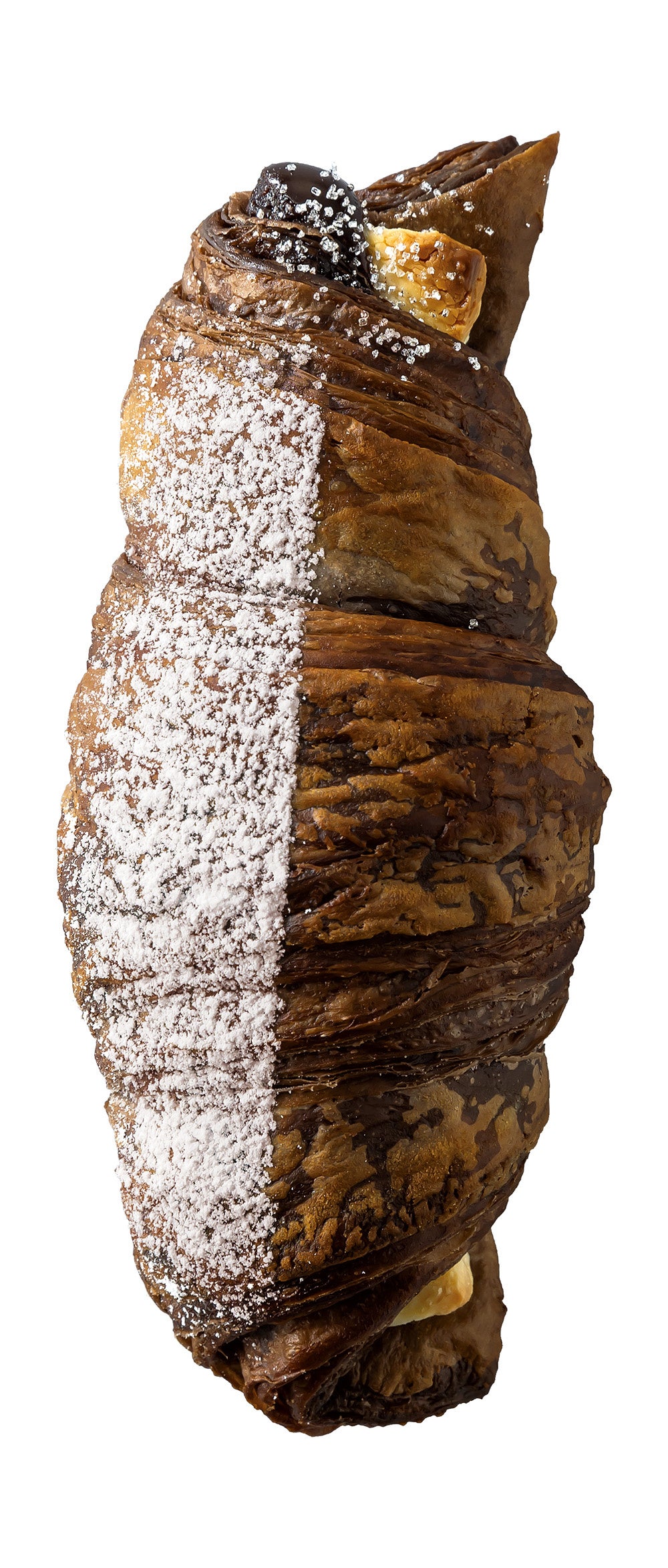 デコレーションには、ココア生地を引き立たせるため、粉糖は半分だけに。そして先端にはきらめく銀箔シュガーをかけ、ロマンチックで見た目から楽しめるプレミアムチョコクロとなっております。