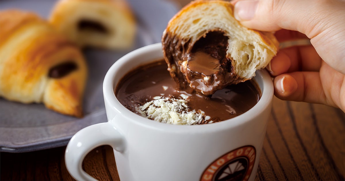 サンマルクカフェの看板商品「チョコクロ」を、期間限定の「トリプル・メルティホットチョコレート」にディップして食べると、いつものサクサク感だけでなく、クロワッサン生地にチョコレートが染み込み、しっとりした食感をお楽しみいただけます。チョコクロと濃厚なホットチョコレートの相性が抜群です。