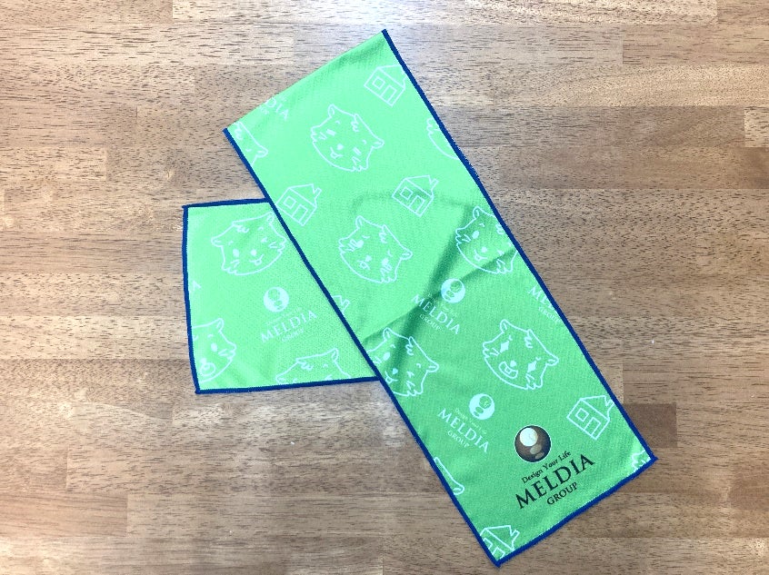 当日、ツイッター画面のご確認をスタッフが行わせていただき、その場で先着1200名様に「メルディアグループオリジナル冷感タオル」をプレゼント!