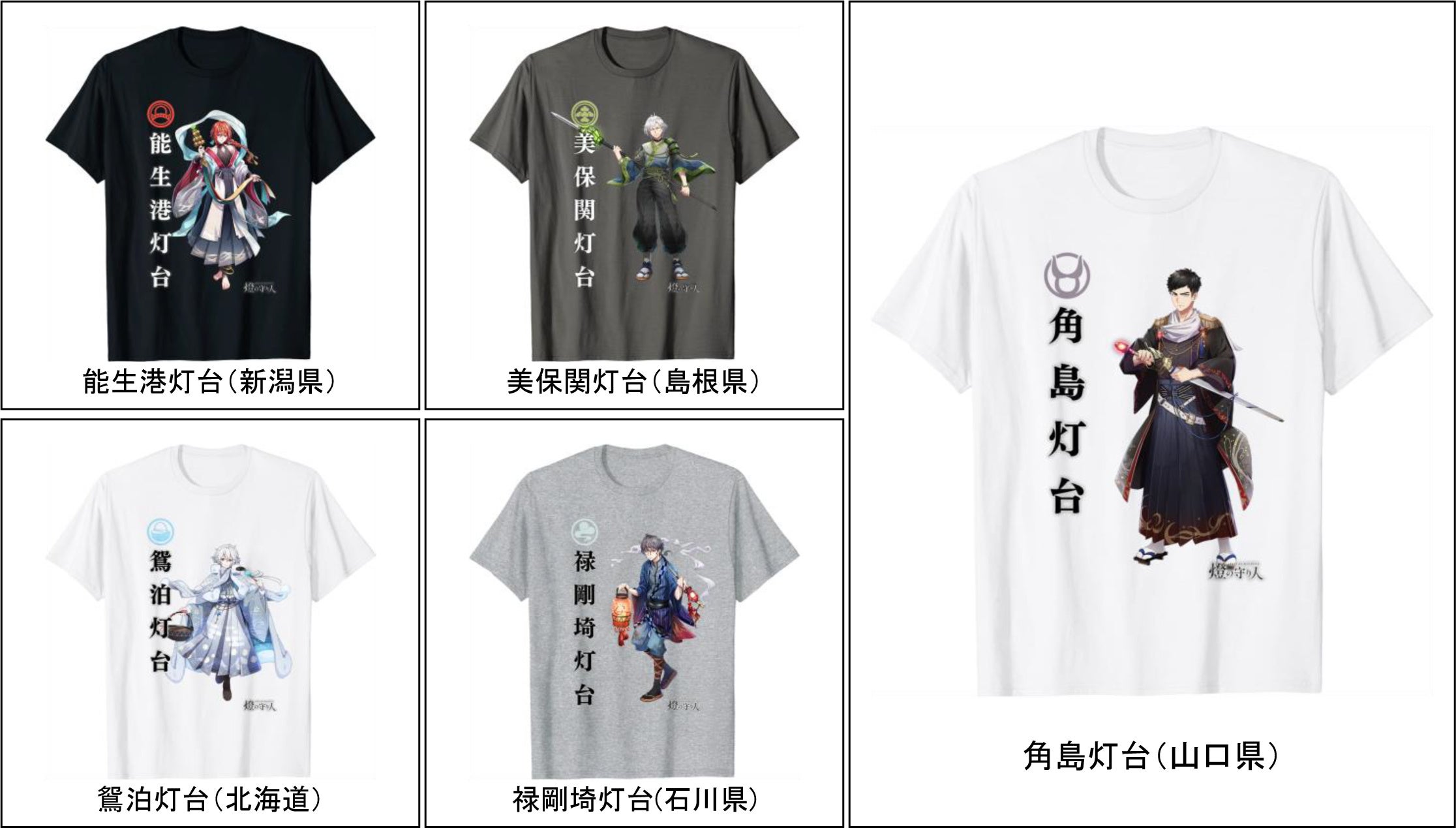 Amazon Merch on Demand(アマゾン マーチオンデマンド)にて好評発売中の『燈の守り人』アパレルグッズに、全国各地の“守り人”がデザインされたキャラクターTシャツシリーズが新たなラインナップとして登場します。現在、40体以上が公開されている “守り人”のキャラクターデザインには、それぞれの灯台の特色や地域のストーリーが盛り込まれており、それらの意匠を存分に楽しめるTシャツとなっています。今回、記念すべきシリーズ第一弾として登場するのは、角島灯台(山口県)、美保関灯台(島根県)、禄剛埼灯台(石川県)、能生港灯台(新潟県)、鴛泊灯台(北海道)、樫野埼灯台(和歌山県)、経ヶ岬灯台(京都府)、陸中黒埼灯台(岩手県)、潮岬灯台(和歌山県)、出雲日御碕灯台(島根県)の10灯台。今後も続々と、新たなキャラクターTシャツをお届けしますのでご期待ください。