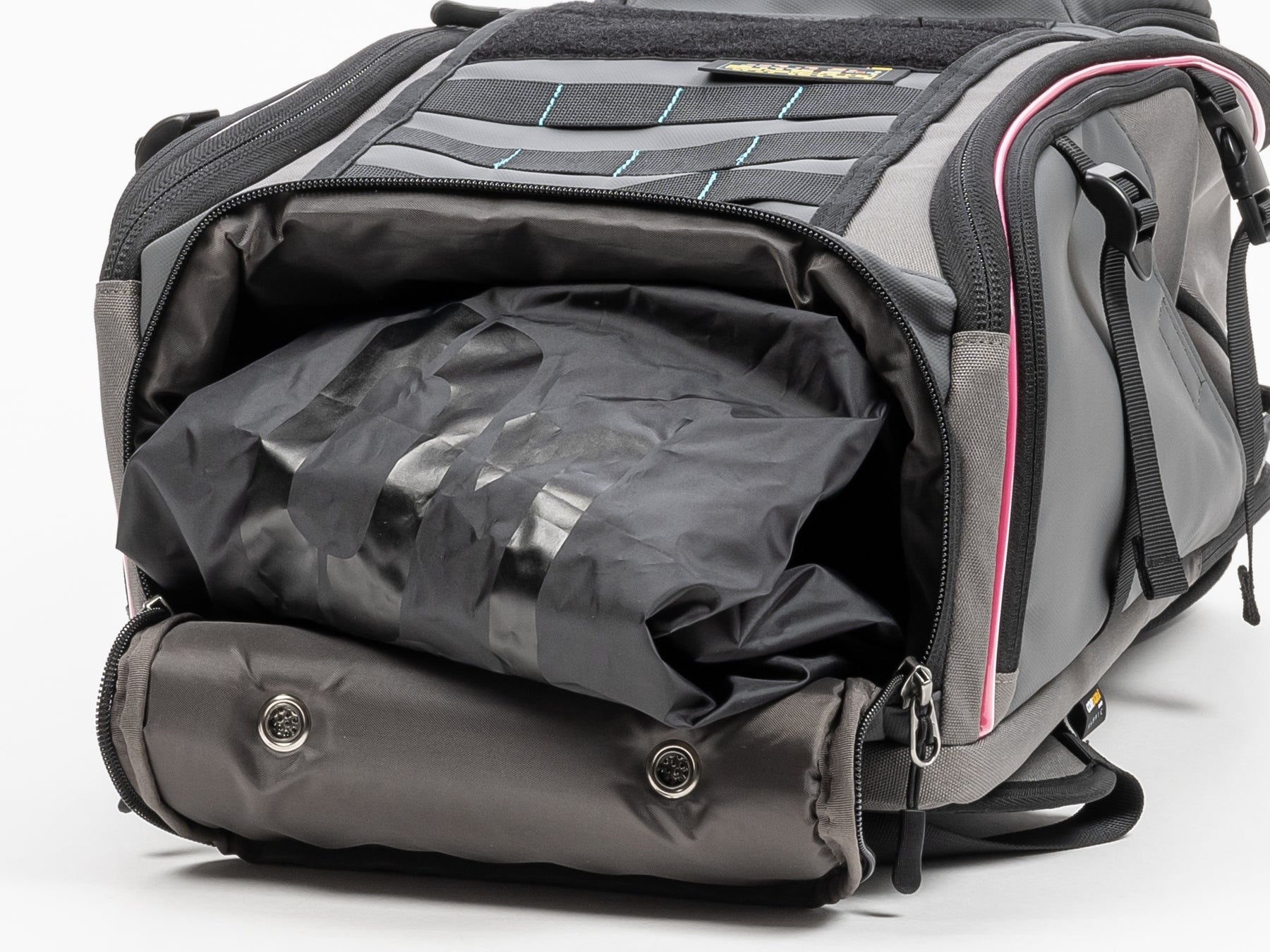マチが約20cm程ある大容量メインエリアは、ものが見つけやすいよう最大180度の開閉が可能で、バッグの奥に収納したアイテムの出し入れがしやすいようになっております。