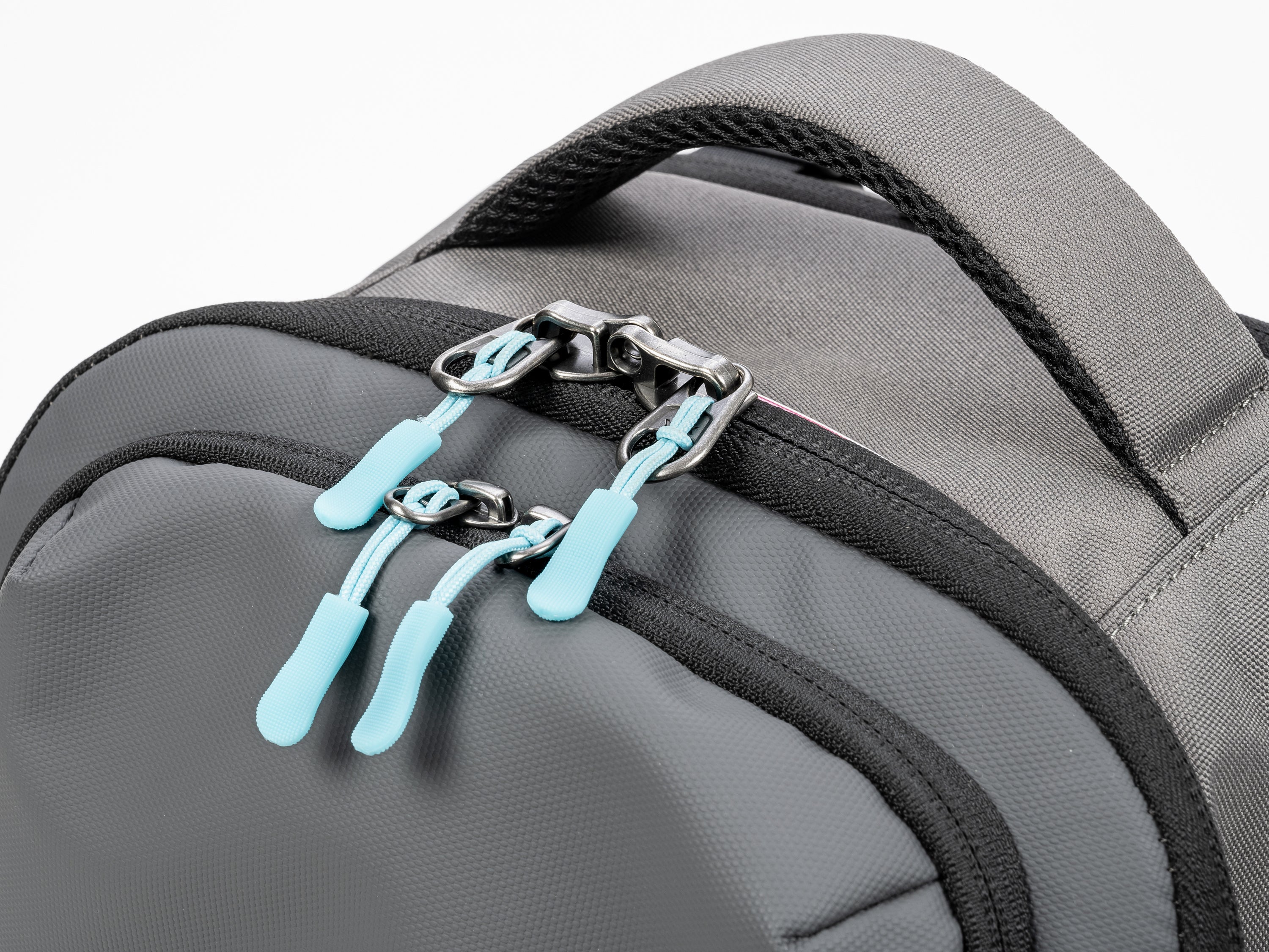 ファスナーの引き手紐や、メインエリアのファスナー付近のパイピングラインに『初音ミク』を思わせるカラーを配置いたしました。