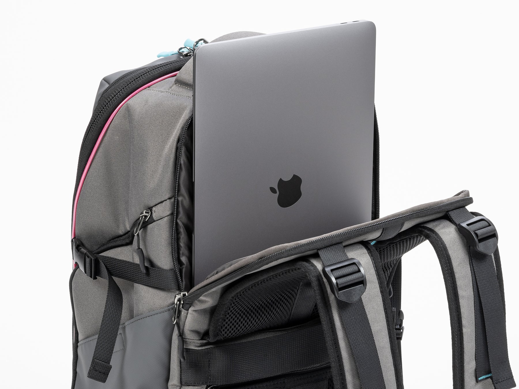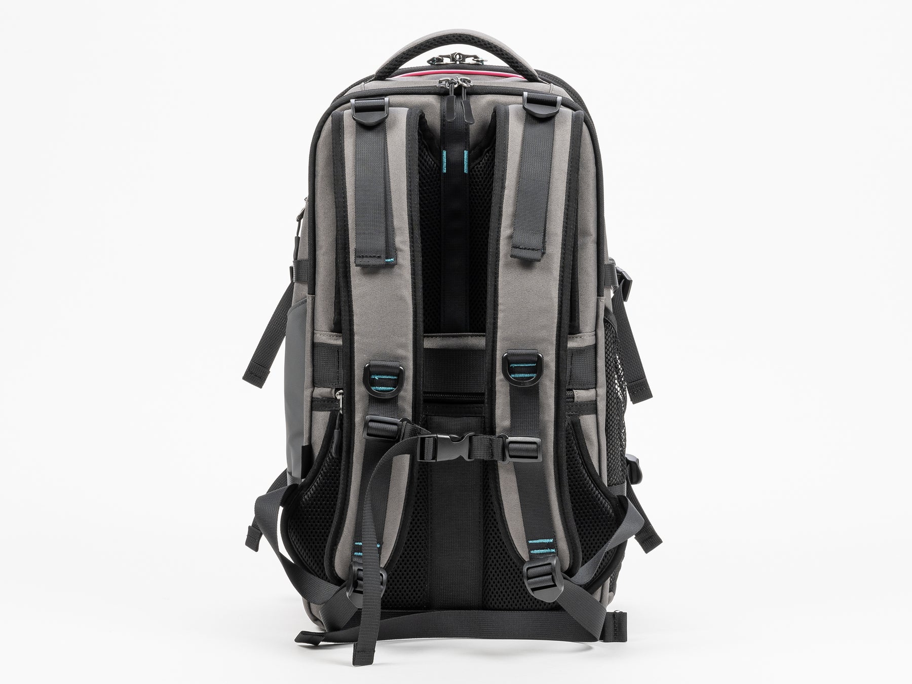 また、背中側にはノートPCやA4サイズのノートや書類が収納できるクッション素材を使用したスペースを用意。