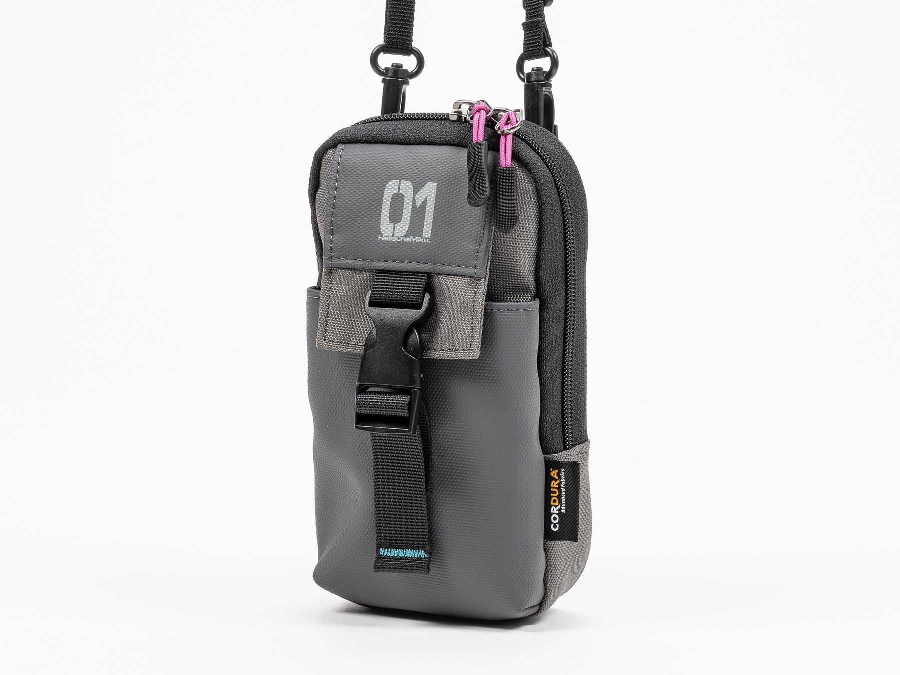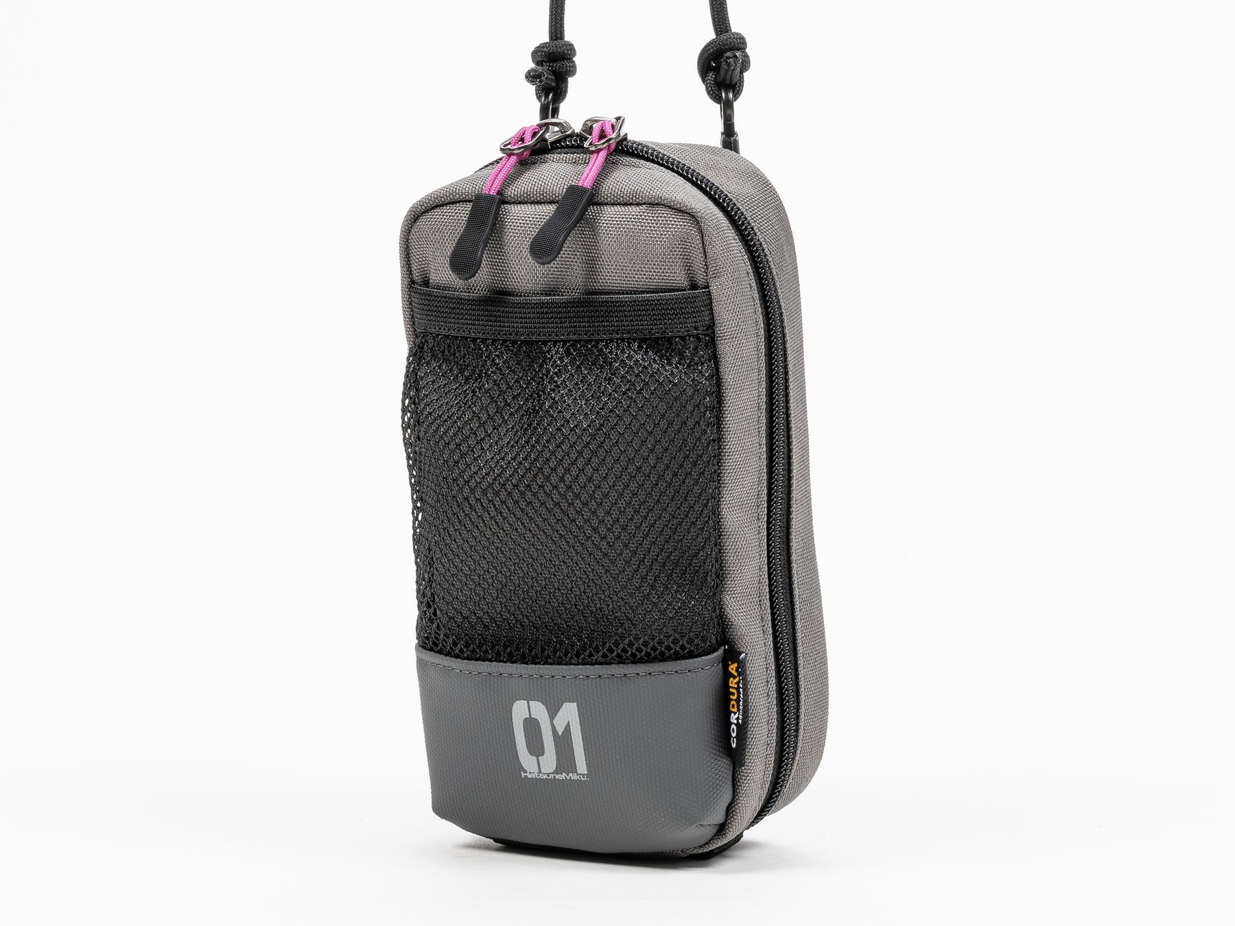 フロントにスマートフォンが収納できるサイズのメッシュポケットを配置したショルダーポーチです。