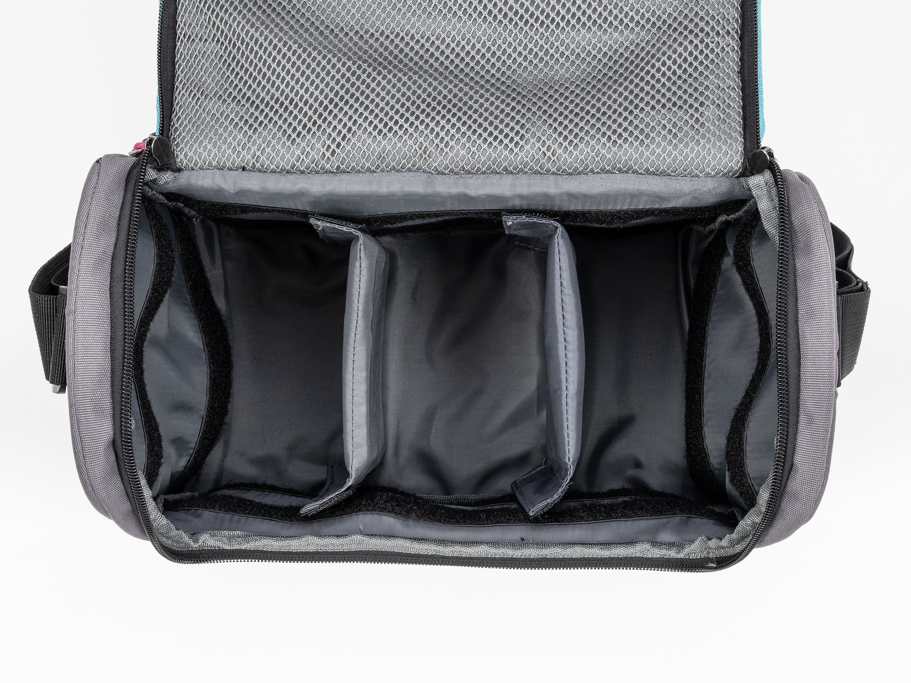 収納スペースの内側にベルクロを配置しておりますので、2枚の仕切りを収納アイテムにあわせて位置を変えることができます。仕切りが不要な場合は、スペースの端に配置して大きな1つのスペースにすることも可能です。