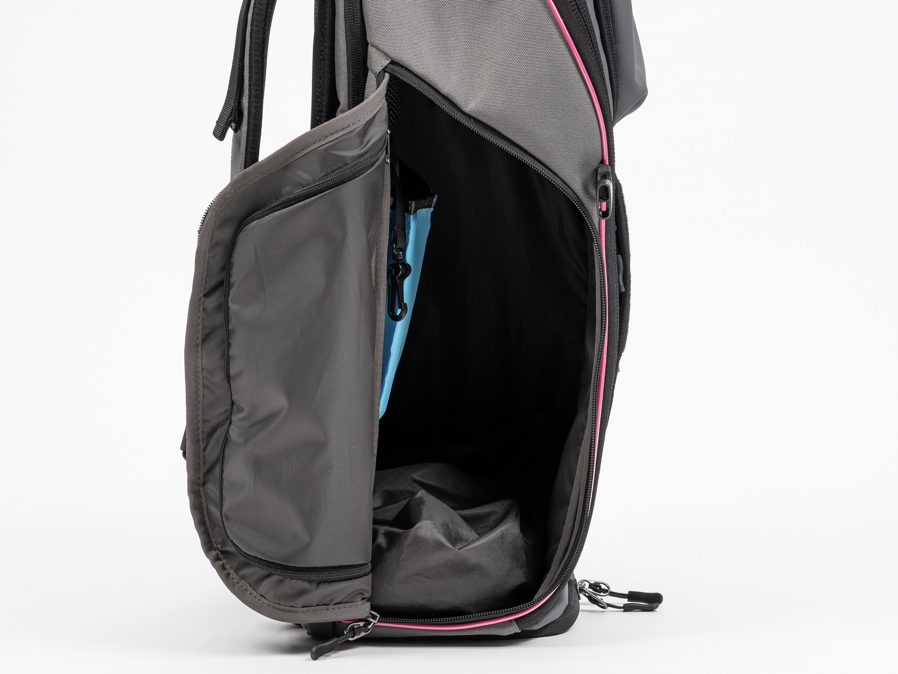 また、メッシュポケット側からはメインエリアにもアクセスができるファスナーを用意しております。
