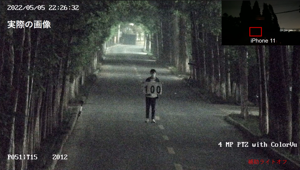 夜に補助ライトオフの状態で実際に撮った映像をご覧ください。比較として、右上にはiPhone11が撮った画像になります。圧倒的な画質は一目で分かると思います。