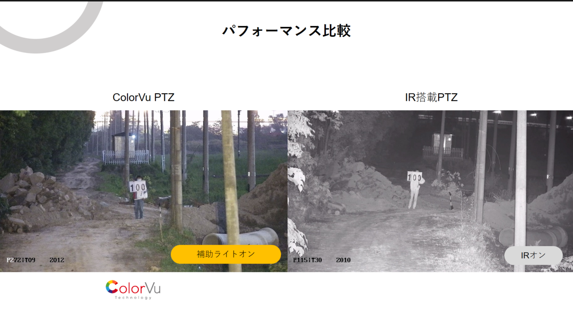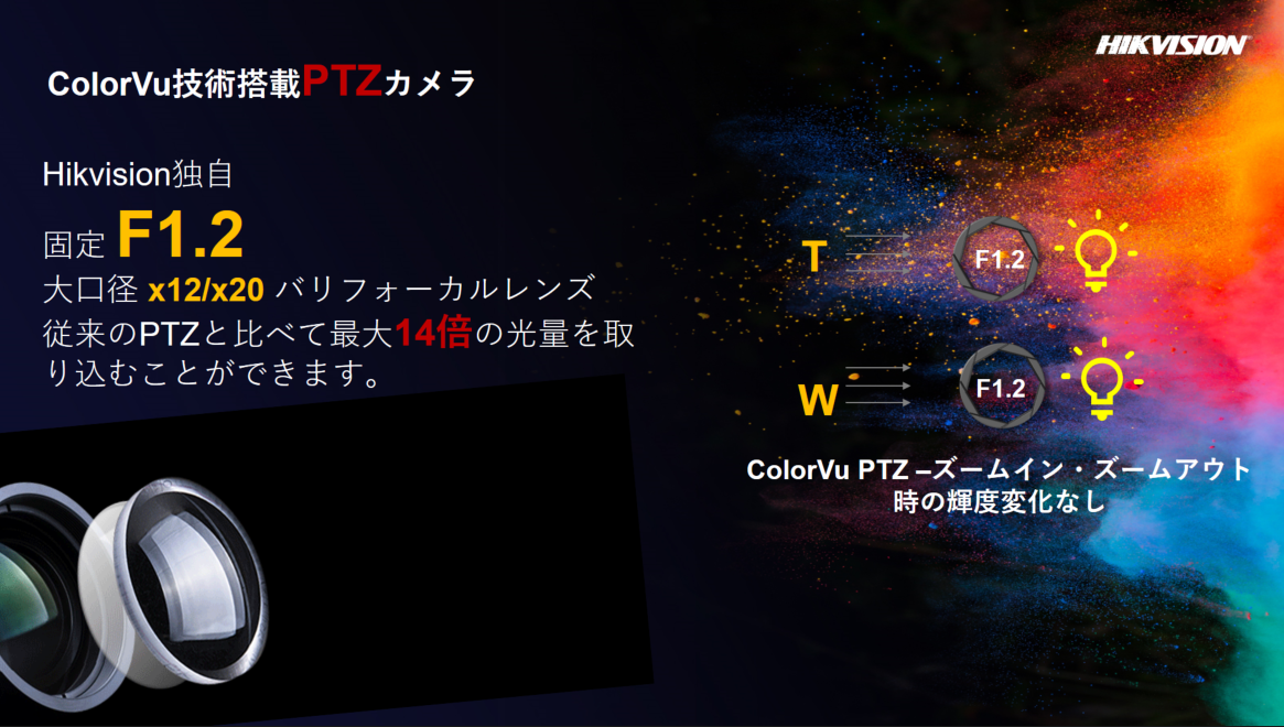 通常の固定カメラは監視距離が短くカラフルな映像を実現するのは比較的に容易でありますが、PTZカメラはズーム倍率が高くて広範囲で撮影することが特徴なので、遠くまでカラフルな映像を撮るのはより難しかったです。HikvisionはColorVu技術に専念し、ようやくColorVu技術をPTZカメラに取り込めることができました。固定 F1.2の大口径バリフォーカルレンズが搭載することにより、従来のPTZと比べて最大14倍の光量を取り込むことができます。そのおかげで、夜間でも100メートルまで鮮やかな映像を撮ることができました。