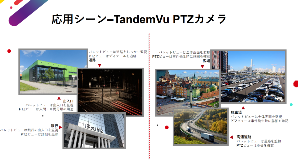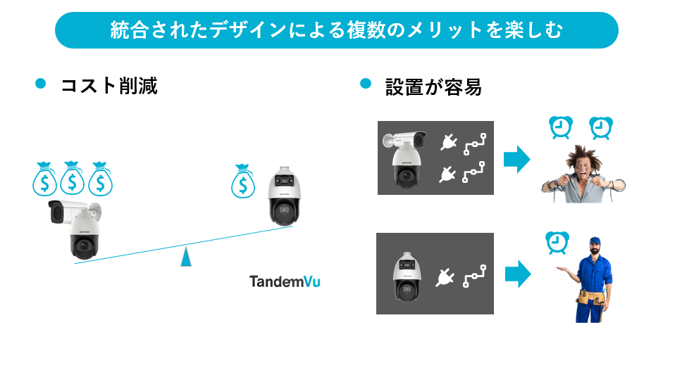 従来にPTZカメラとバレットカメラ総計2つでしかカーバーできないシナリオには、TandemVu PTZカメラ一つでカーバーできます。また、カメラの数が減ったことにより、製品価額や工事費用も安くなります。