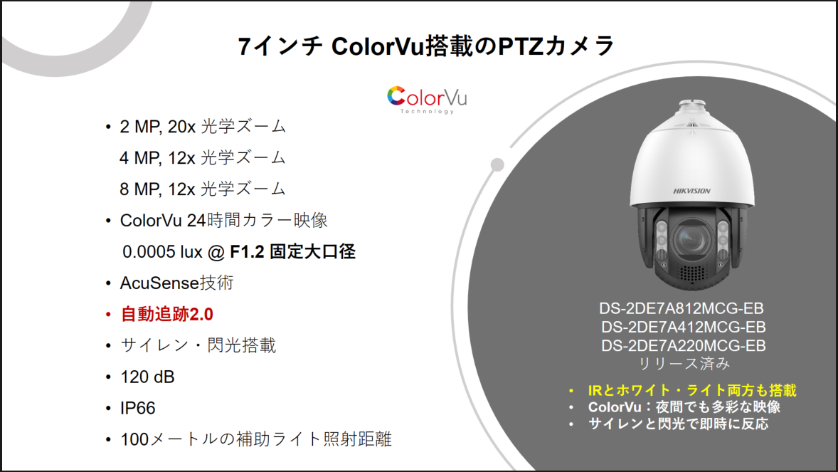 その上、ColorVu技術を搭載することにより、高画質な画像を実現しました。また、カメラ自身はマイクとスピーカーが搭載されており、携帯など遠隔から現場と通話することができ、PTカメラ一台でかなり万能です。