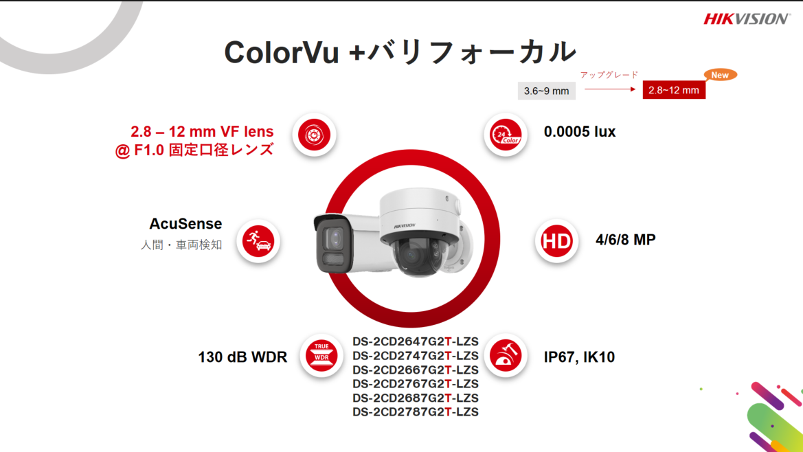 皆さんがご存知だと思いますが、HikvisionのColorVu技術において、固定F1.0の大口径レンズが重要な一環であります。バリフォーカルレンズも同じく、焦点距離と関わらなくF1.0大口径レンズを実現しましたが、今までのColorVuバリフォーカルカメラは焦点稼働範囲が「3.6~9 mm」であり、通常のIRバリフォーカルカメラより少し狭かったです。なお、弊社の技術者がColorVu技術を磨き続き、やっと焦点稼働範囲を「2.8~12 mm」にアップグレードすることができました。そして、価格も前代の機種より10%ぐらい下がりました。ご興味がお持ちのお客様は是非弊社の営業までお問い合わせください。