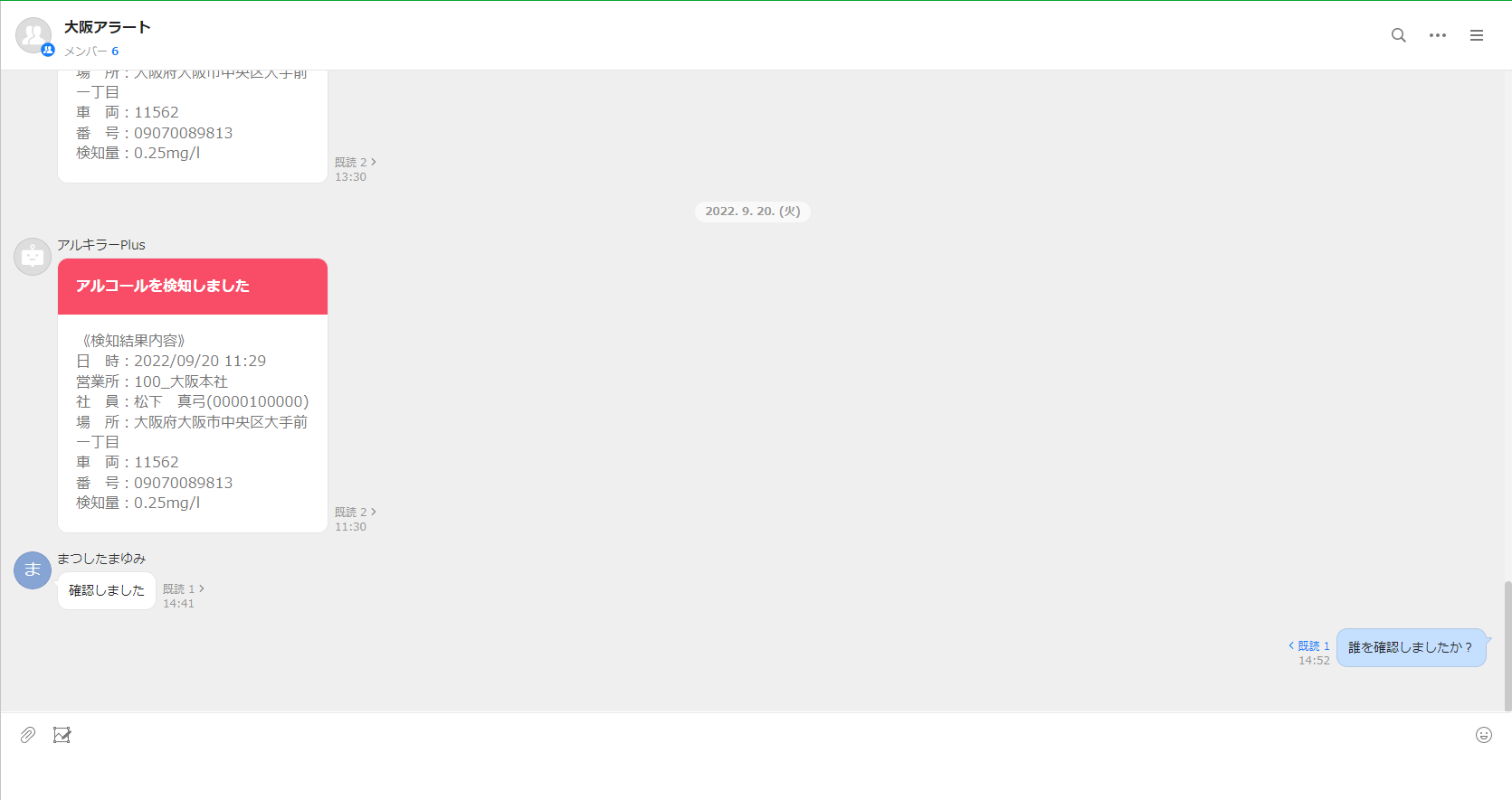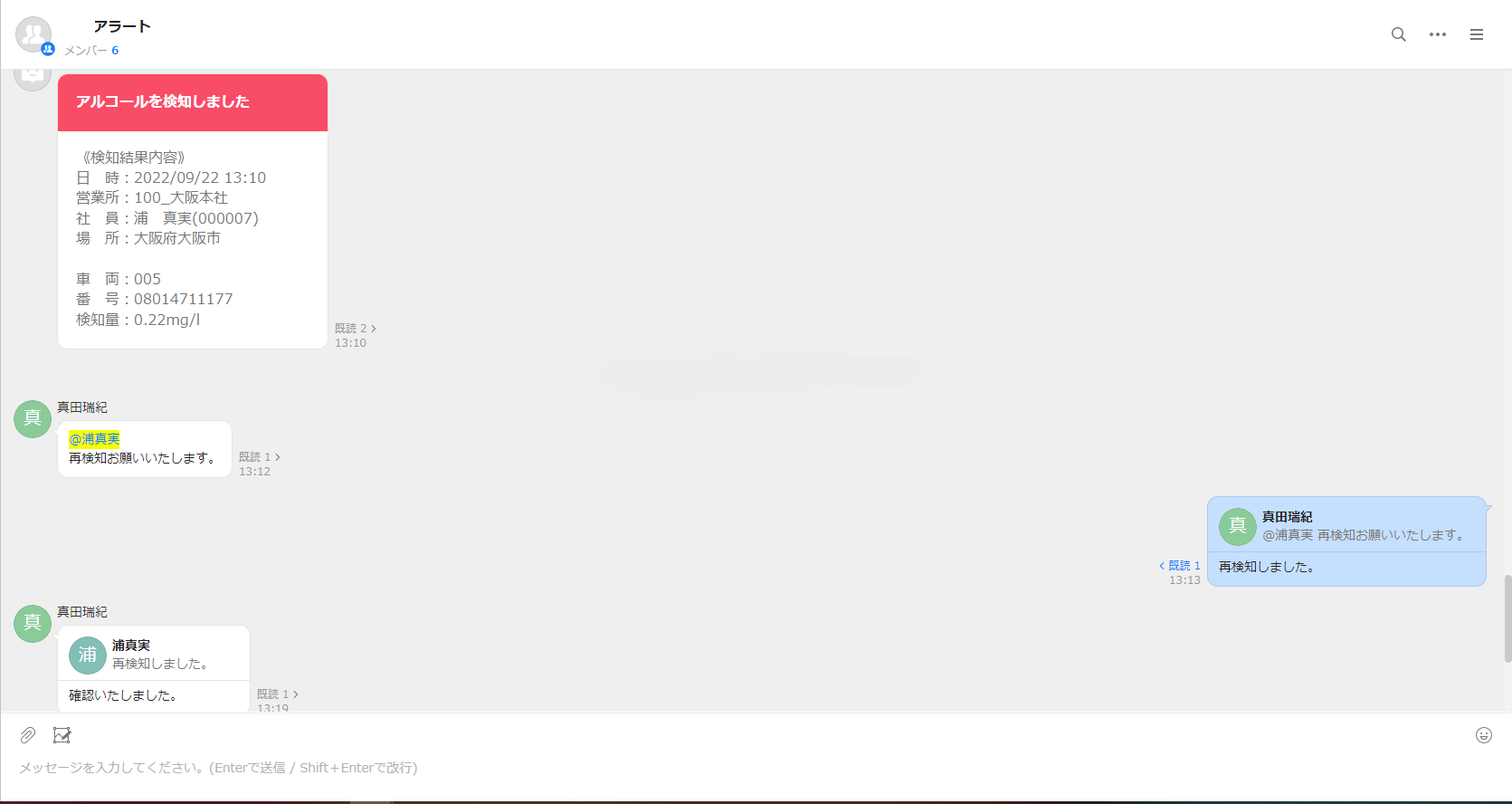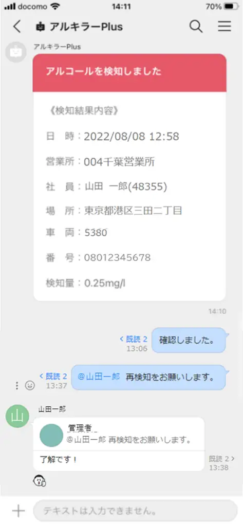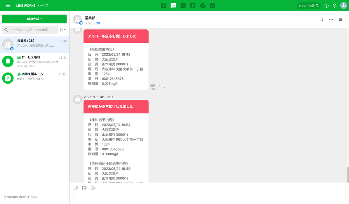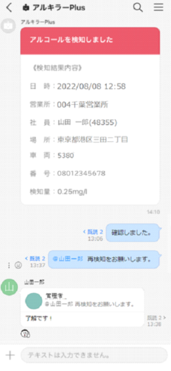 「アルキラーNEX/Plus」がアルコールを検知した場合に、即座に「LINE WORKS」のチャット(トーク)上で受け取ることができ、管理者が検知結果を迅速に確認、その後の対応/やりとりも「LINE WORKS」上で可能になります