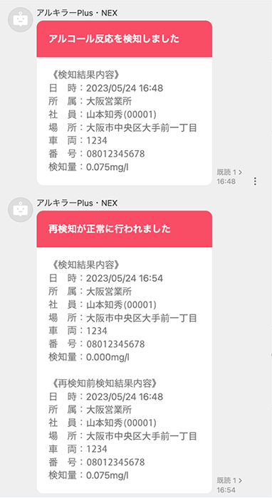 「アルキラーNEX」でアルコール反応を検知しアラートメールや通知が届いた後に、無反応の検知を行うと再度メールや通知が届くようになります。(これまでは、再検査し無反応だった場合に通知は来ず、アルキラーの管理画面にアクセスし、結果を確認する必要がありました)