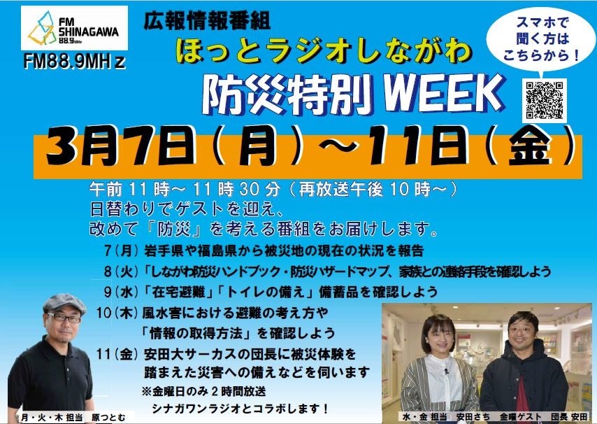 東京都品川区のコミュニティFM局 FM88.9MHz「FMしながわ」で毎週月~金曜日11時(再放送:同日22時)から放送中の品川区広報情報番組「ほっとラジオしながわ」では3月7日~11日、「防災特別WEEK」を実施します。