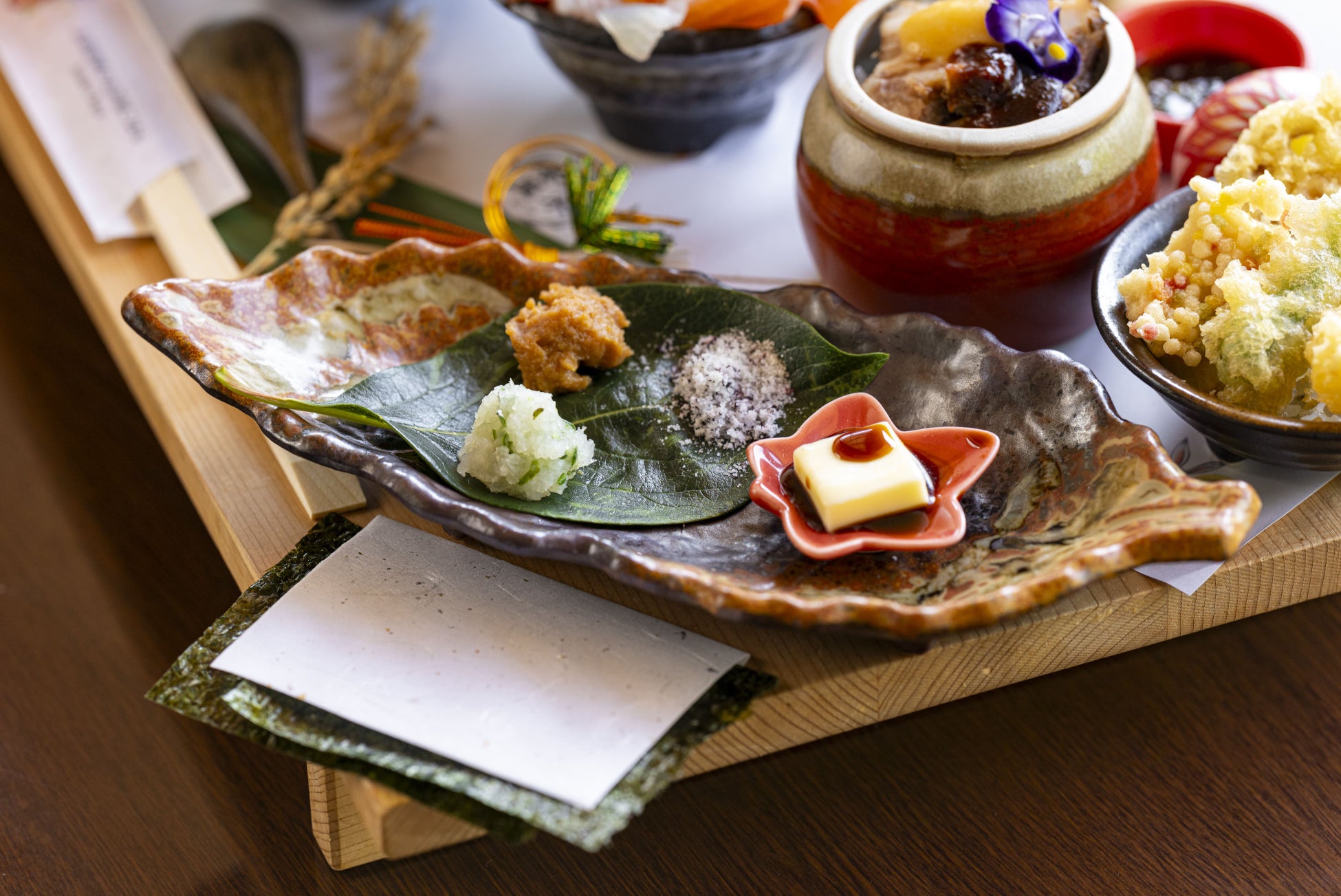 ただ“食べる”だけではなく、五感で体験しステキな思い出を作っていただきたいという想いを込めてメニューを考案しています。新鮮な食材の香りや食感、料理の盛り付けや食べ方を、五感で体験する新たな御膳をお召し上がりいただけます。