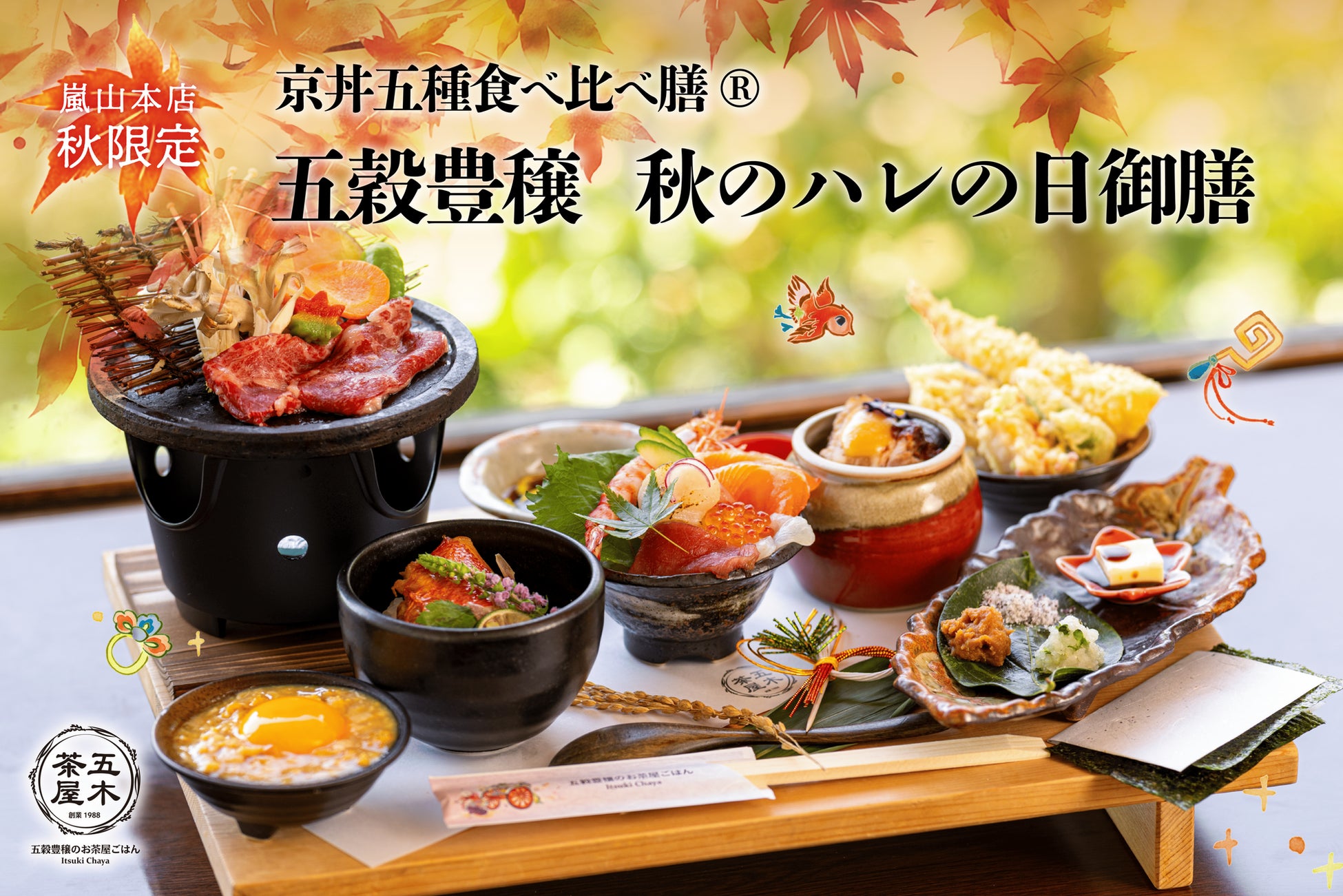 秋限定の五穀豊穣のお茶屋ごはん®︎五木茶屋 嵐山本店による【秋の京丼五種食べ比べ膳®︎】