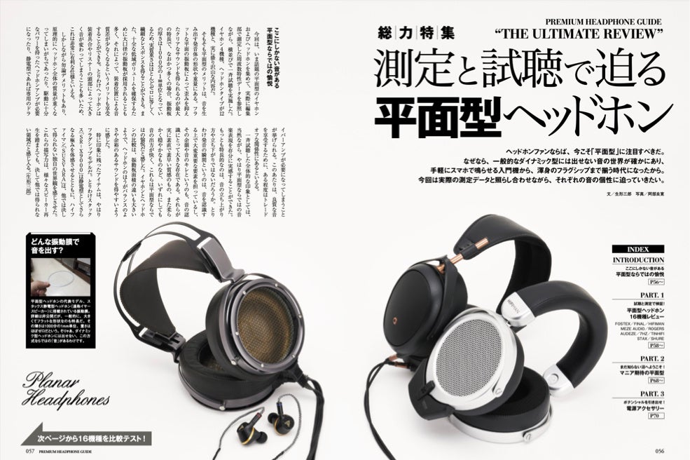 繊細かつクリアな愉悦のサウンドでヘッドホンファンから大きな注目を浴びている「平面型ヘッドホン」。人気のモデル16機種を測定し検証した試聴レポート、マニアが目を付けるレアな6機種レポート、平面型モデルのポテンシャルを引き出す電源アクセサリーの紹介をお届け。