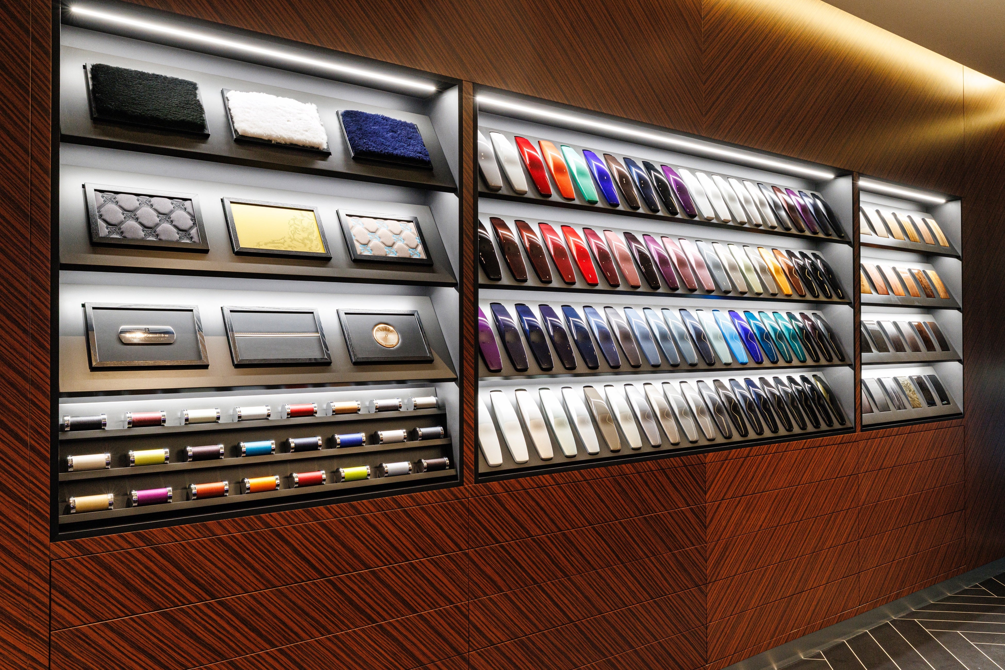 この新しいショールームの核となるビスポークのためのスペース「アトリエ(Atelier)」には、色鮮やかなエクステリアのカラーパレット、ウッドパネル、レザー、刺繍糸、ラムウールやテキスタイルのサンプルといった様々なマテリアルが美しくディスプレイされており、ロールス・ロイスならではの多彩なカスタマイズの可能性を表し、訪れるお客様に創造的なインスピレーションを提供いたします。