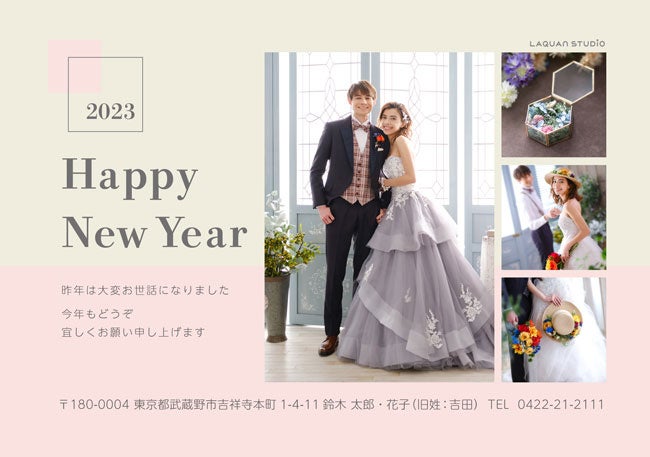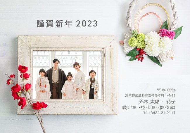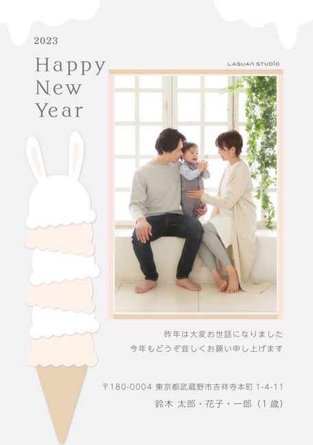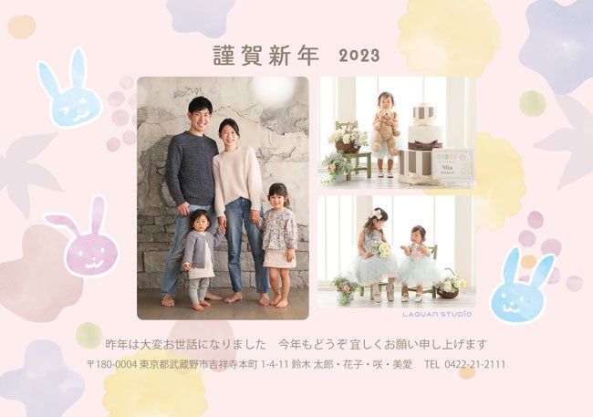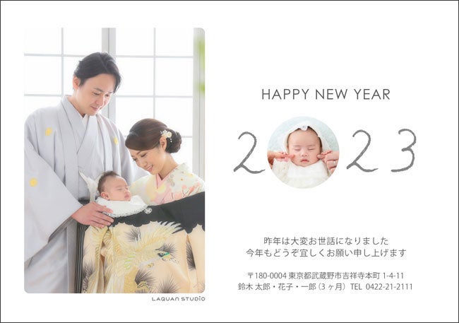 全国に26店舗の写真館を運営する株式会社らかんスタジオ(所在地:東京都武蔵野市吉祥寺本町1-4-11、代表取締役 鈴木観)は、11月1日(火)から「らかんオンライン」で2023年の年賀状の注文受付を開始します。定番からおしゃれなものまでオリジナルデザインが豊富で、注文方法も簡単。プロによる印刷クオリティで、こだわり派の方にも満足いただける1枚をお届けします。(https://laquan.com/nenga.html)忙しい方やもっと気軽にカードを送りたい方には、無料で作れてスマホで送れるdGreetingもご用意。結婚、出産、七五三、成人式など、家族の思い出の写真を入れて新年の挨拶ができます。(https://dg.laquan.com/login)